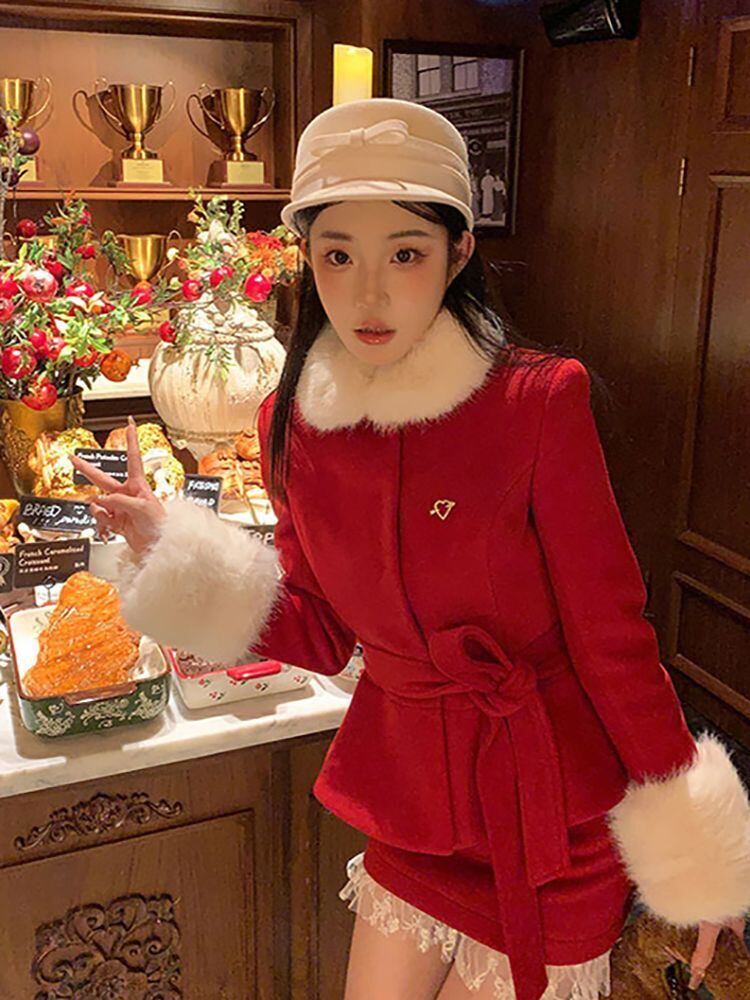 甘いホットガールスーツ秋/冬スリムフィットウールジャケットウエストミニスカート 2 点セット Femlae 大人ガーリー スウィート キュート カジュアル オータム 秋物 ウィンター 冬物