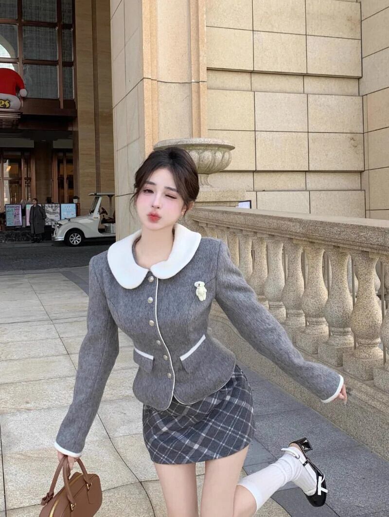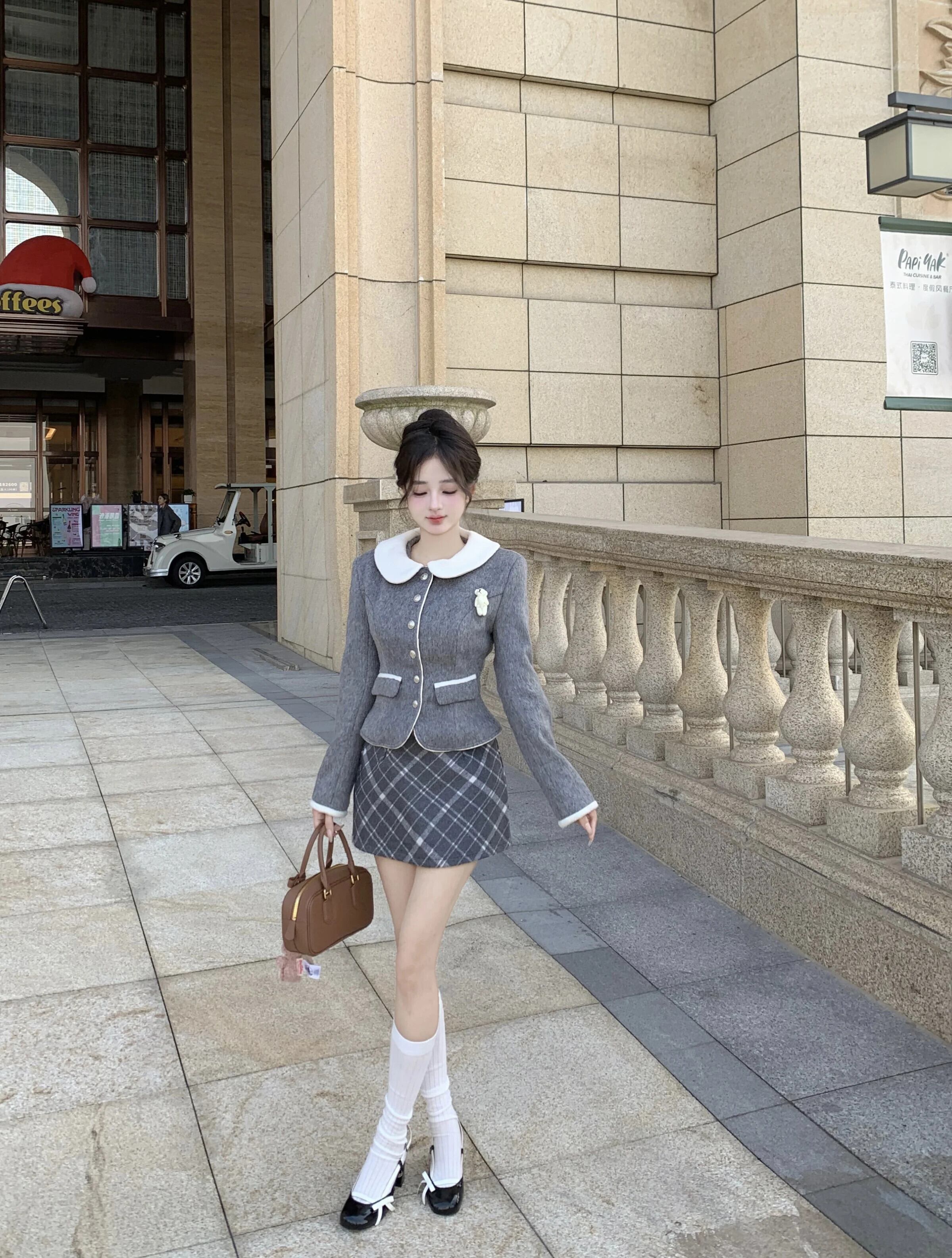 甘いホットガールスーツ冬ピーターパン襟スリムフィットジャケットウエストチェック柄スカートツーピースセット 大人ガーリー スウィート キュート カジュアル ウィンター 冬物