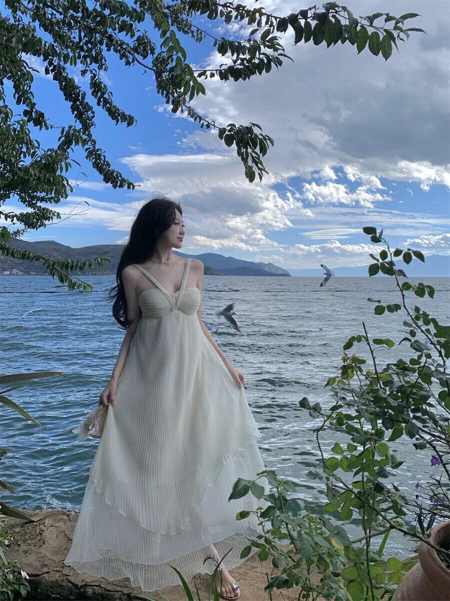 フレンチスイートホットガールセクシーメッシュネックマウントドレス春休みストラップレス妖精レースアップドレス 大人ガーリー スウィート キュート カジュアル スプリング 春物