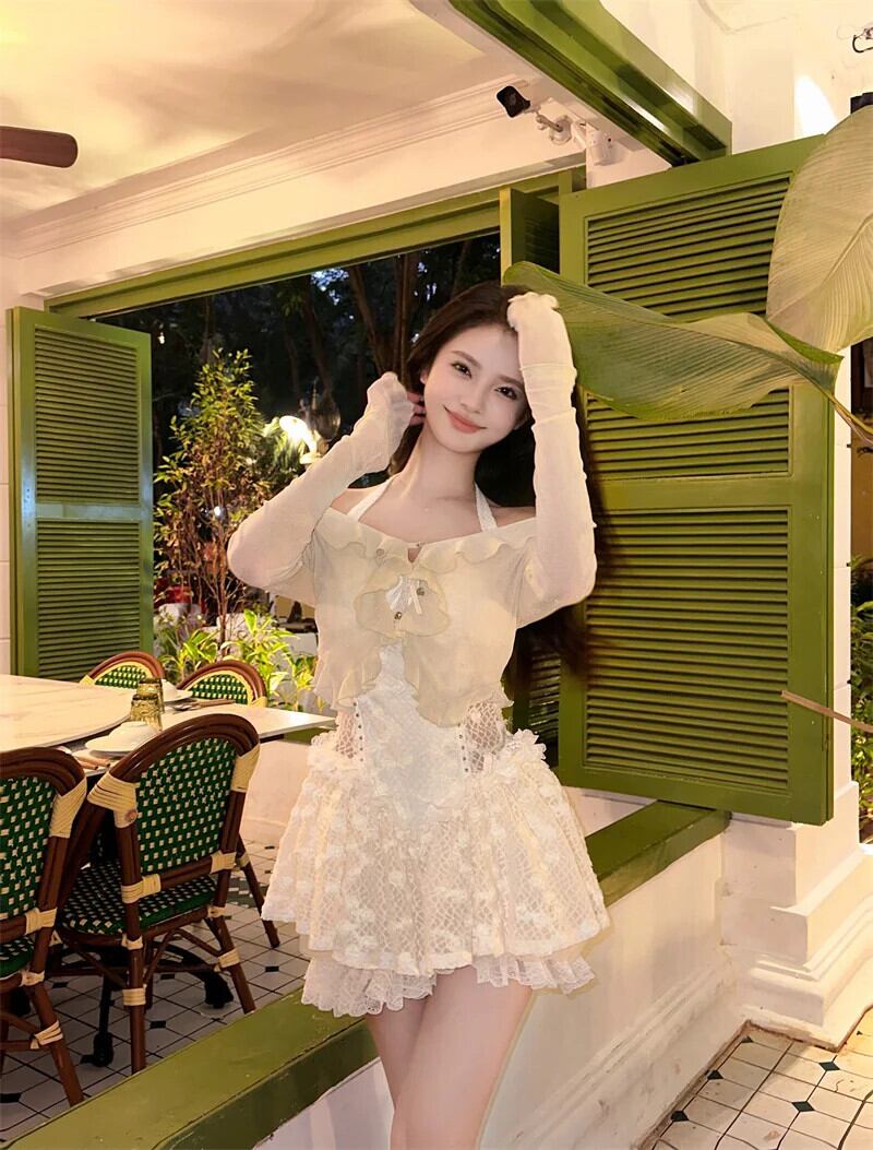 フレンチスイートホットガールスーツ春ホルターネックメッシュドレス春フリルカーディガンツーピースセット 大人ガーリー スウィート キュート カジュアル スプリング 春物