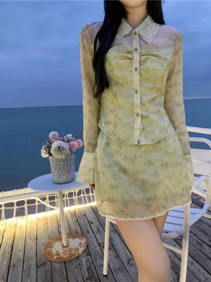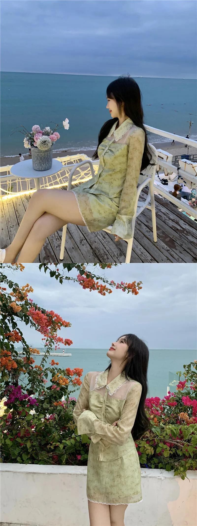 ホットガール中国風レトロスーツ春メッシュパッチワークターンダウン襟トップミニスカートツーピースセット スプリング 春物