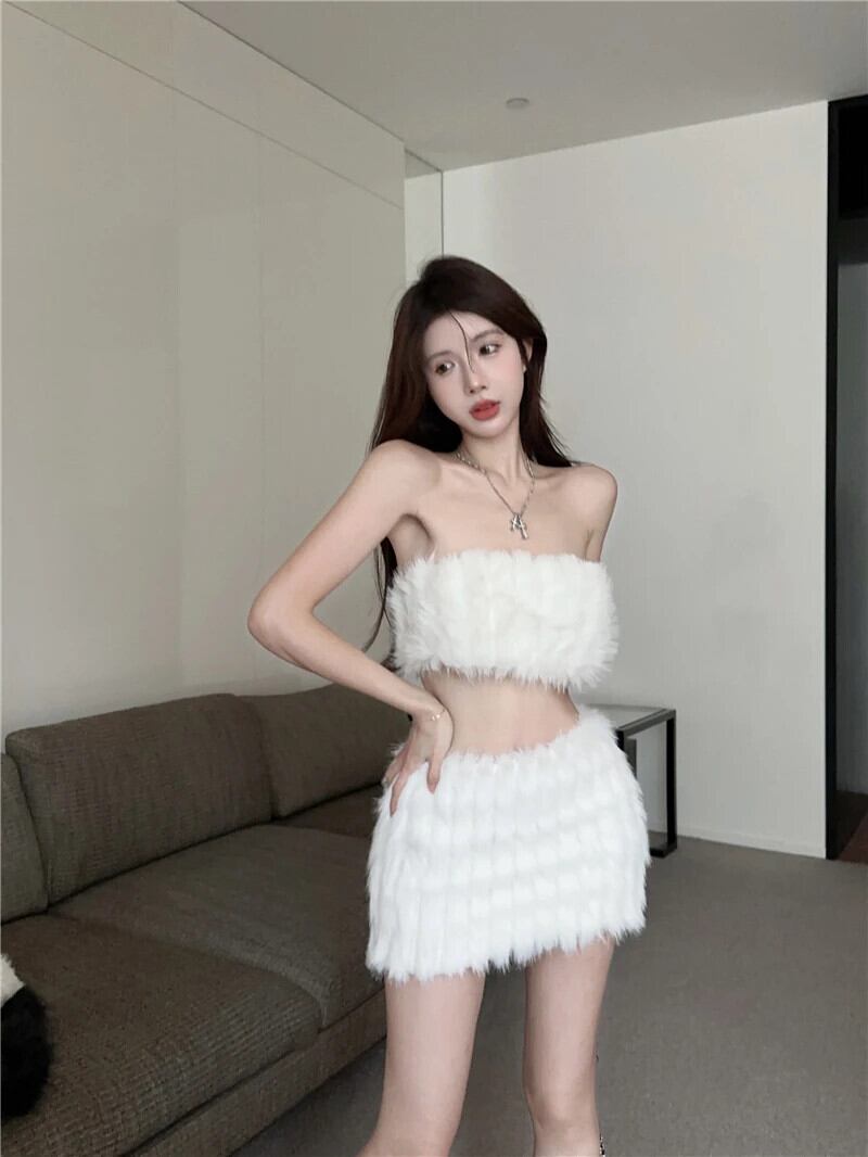 スイートホットガールスーツ秋と冬ストラップレスぬいぐるみトップウエストミニスカートツーピースセット 大人ガーリー スウィート キュート カジュアル オータム 秋物 ウィンター 冬物