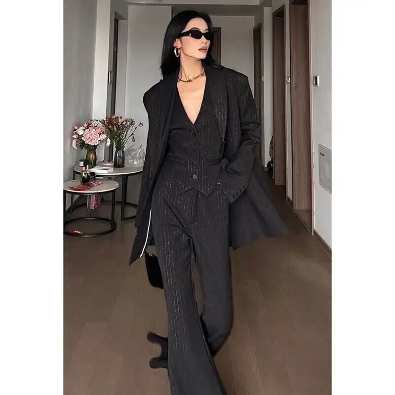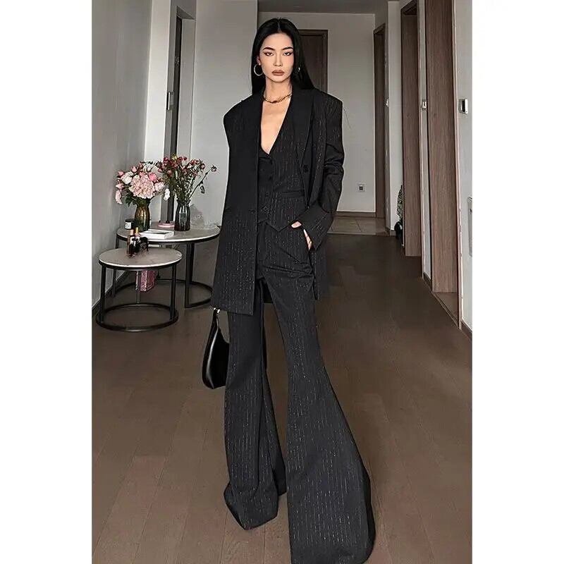 スイートホットガールスーツ春テーラードコート V ネックベストストライプフレアロングパンツ 3 点セット レッド 大人ガーリー スウィート キュート カジュアル スプリング 春物 Vネック