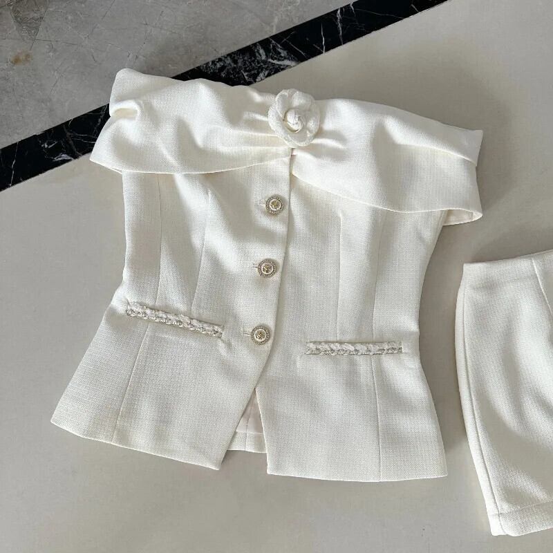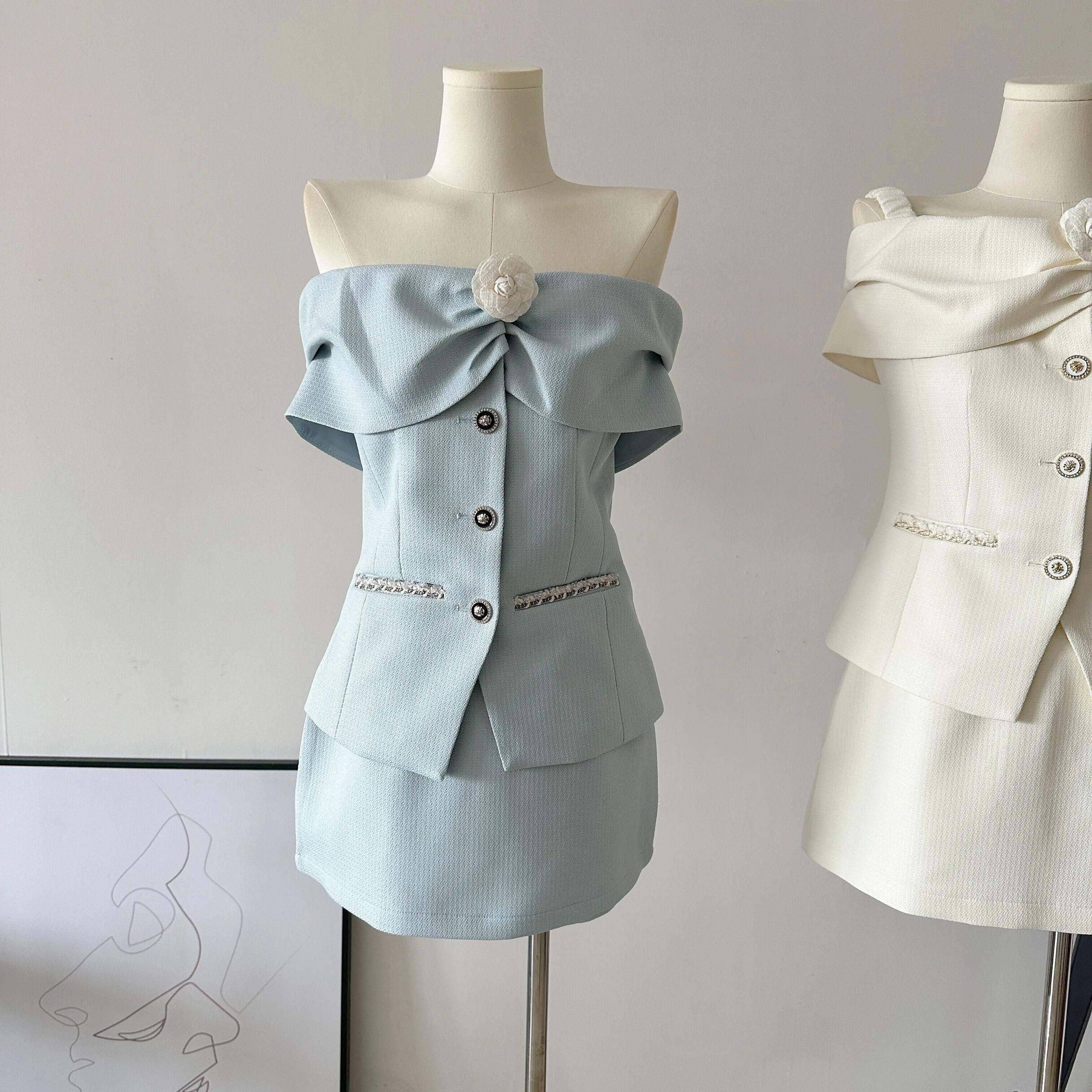 フレンチスイートホットガールスーツ春ニットオフショルダースリムフィットトップウエストスカートパンツツーピースセット 大人ガーリー スウィート キュート カジュアル スプリング 春物
