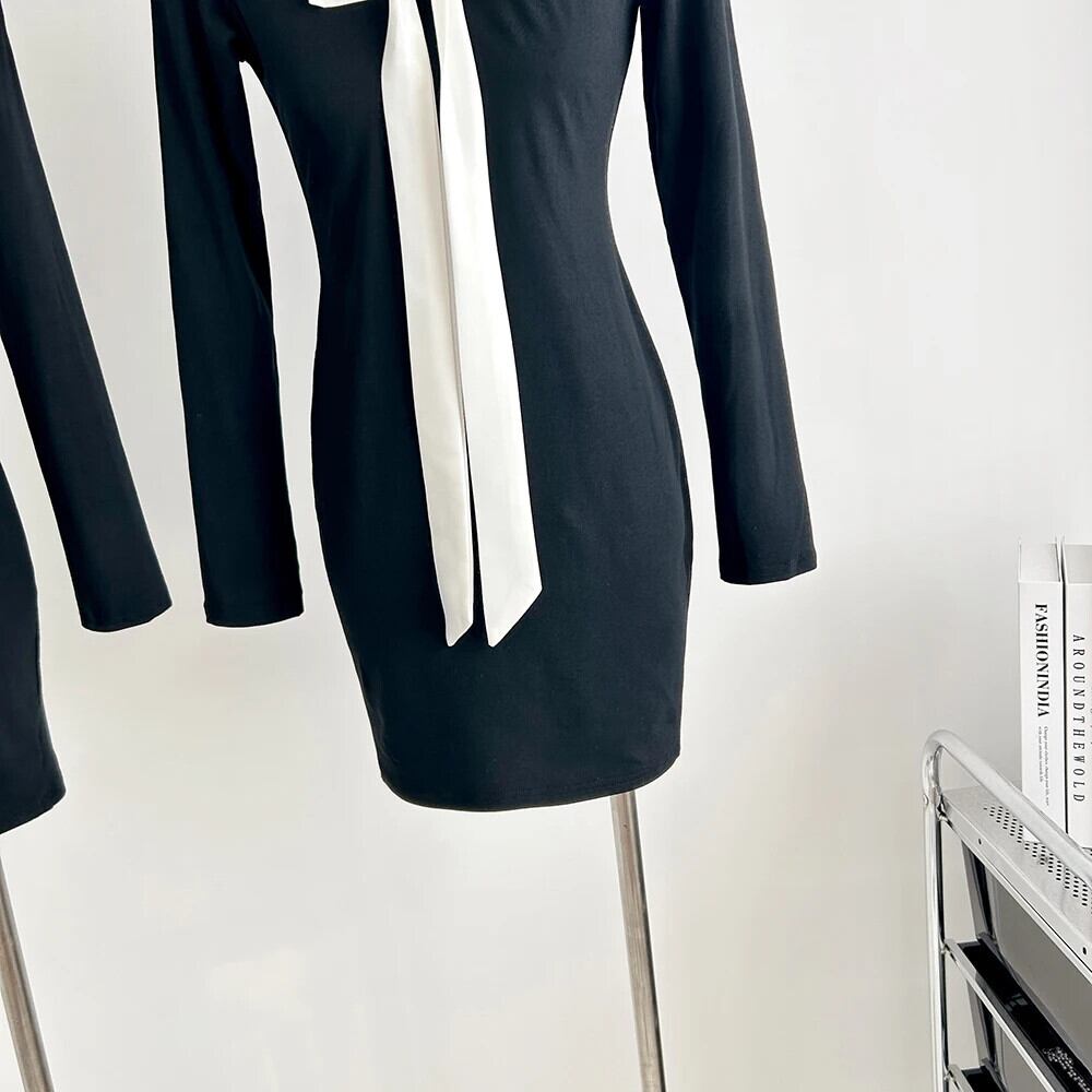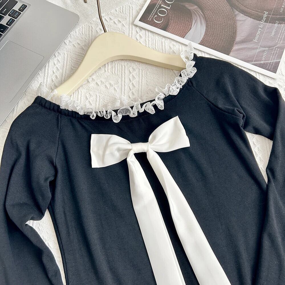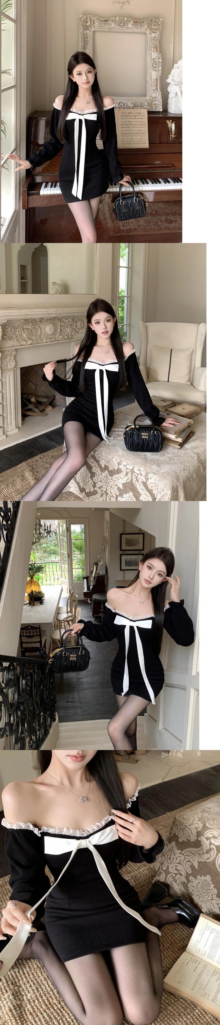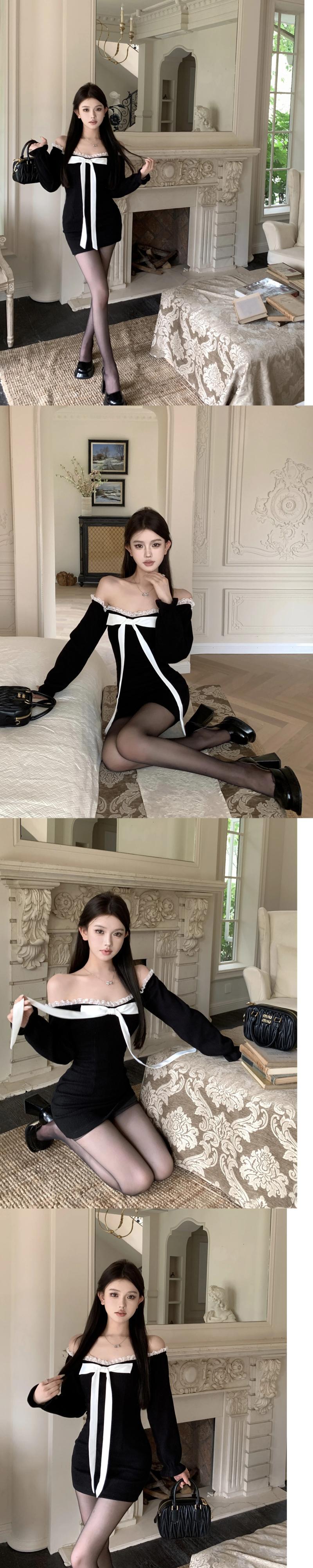 甘いホットガール黒ニットドレス秋と冬レースアップスリムフィットショルダーラップヒップドレス ブラック 大人ガーリー スウィート キュート カジュアル オータム 秋物 ウィンター 冬物