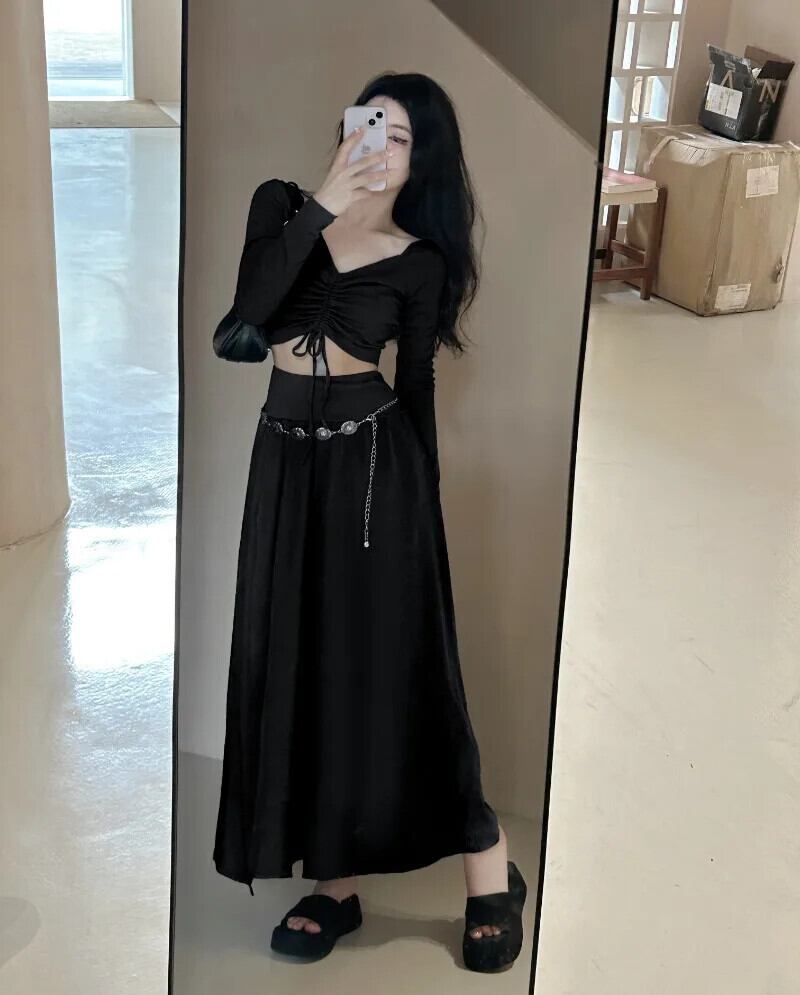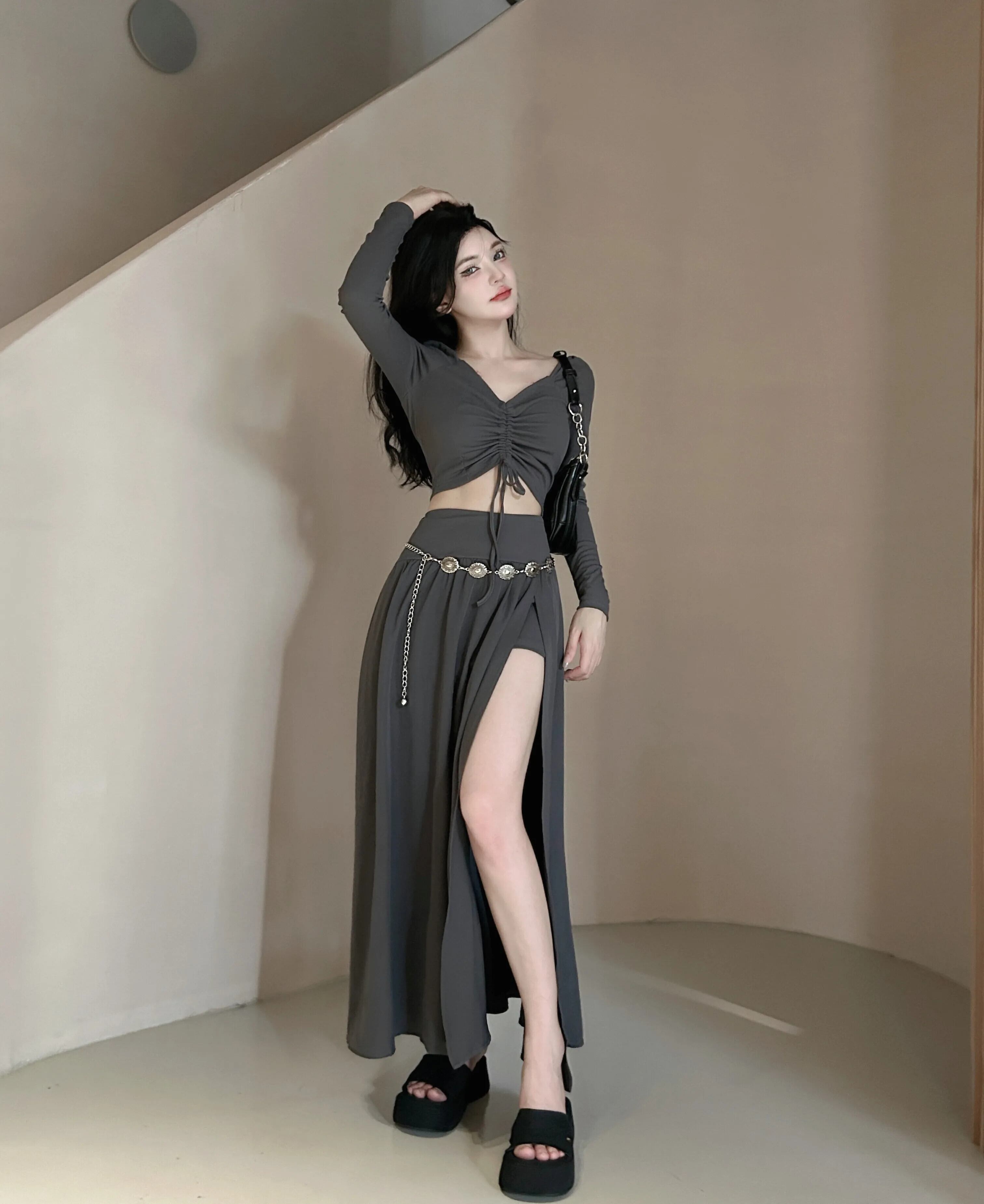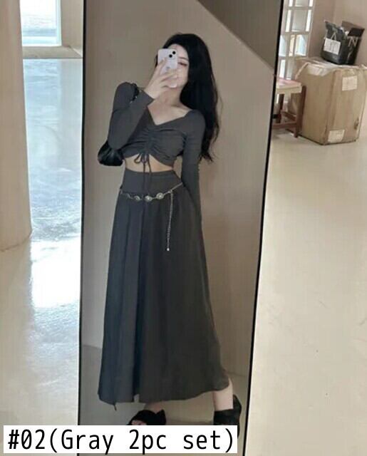 ホットガール純粋セクシースーツ秋/冬長袖オフショルダー Tシャツトップウエストロング弾性スカート 2 点セット エラスティック 伸縮 オータム 秋物 ウィンター 冬物 ピュア