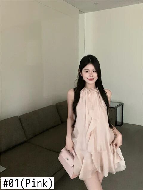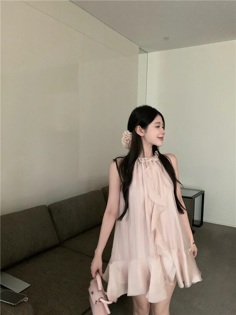 甘いホットガールフリルノースリーブネックホルタードレス夏ルーズ A ラインピンクショートドレス 大人ガーリー スウィート キュート カジュアル サマー 夏物 Aライン