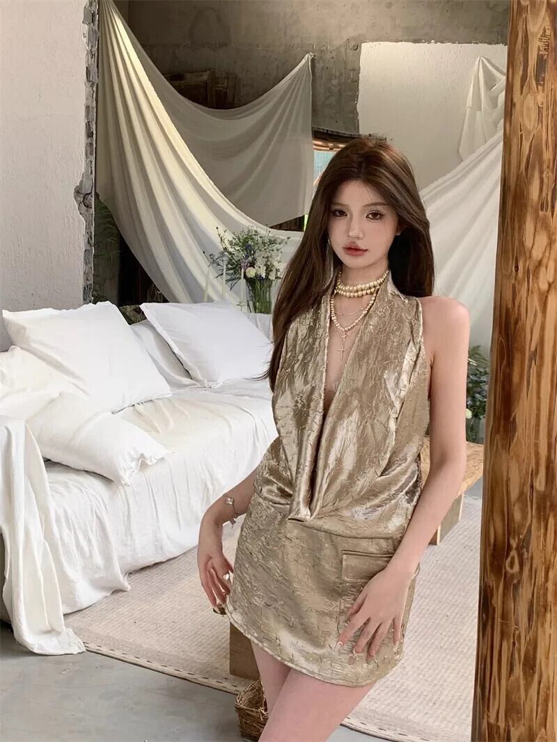 甘いホットガールセクシー背中開いたゴールドネックマウントドレス夏スリムフィット尻ラップショートドレス 大人ガーリー スウィート キュート カジュアル サマー 夏物