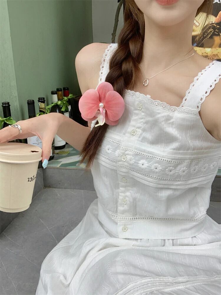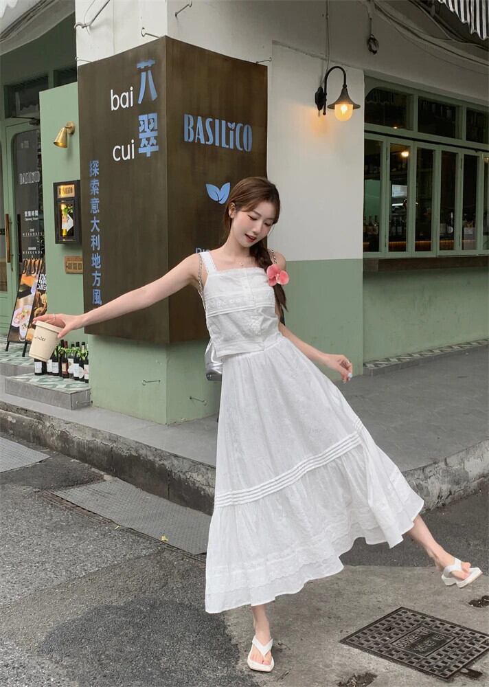 甘いホットガールスーツ春白レースストラップタンクトップウエスト A ラインロングスカート 2 点セット ホワイト 大人ガーリー スウィート キュート カジュアル スプリング 春物 Aライン