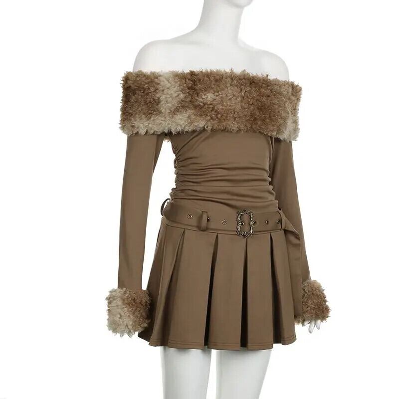 アメリカンスタイルホットガールぬいぐるみパッチワークオフショルダードレス春ベルトスリムAラインプリーツショートドレス スプリング 春物 ハーネス