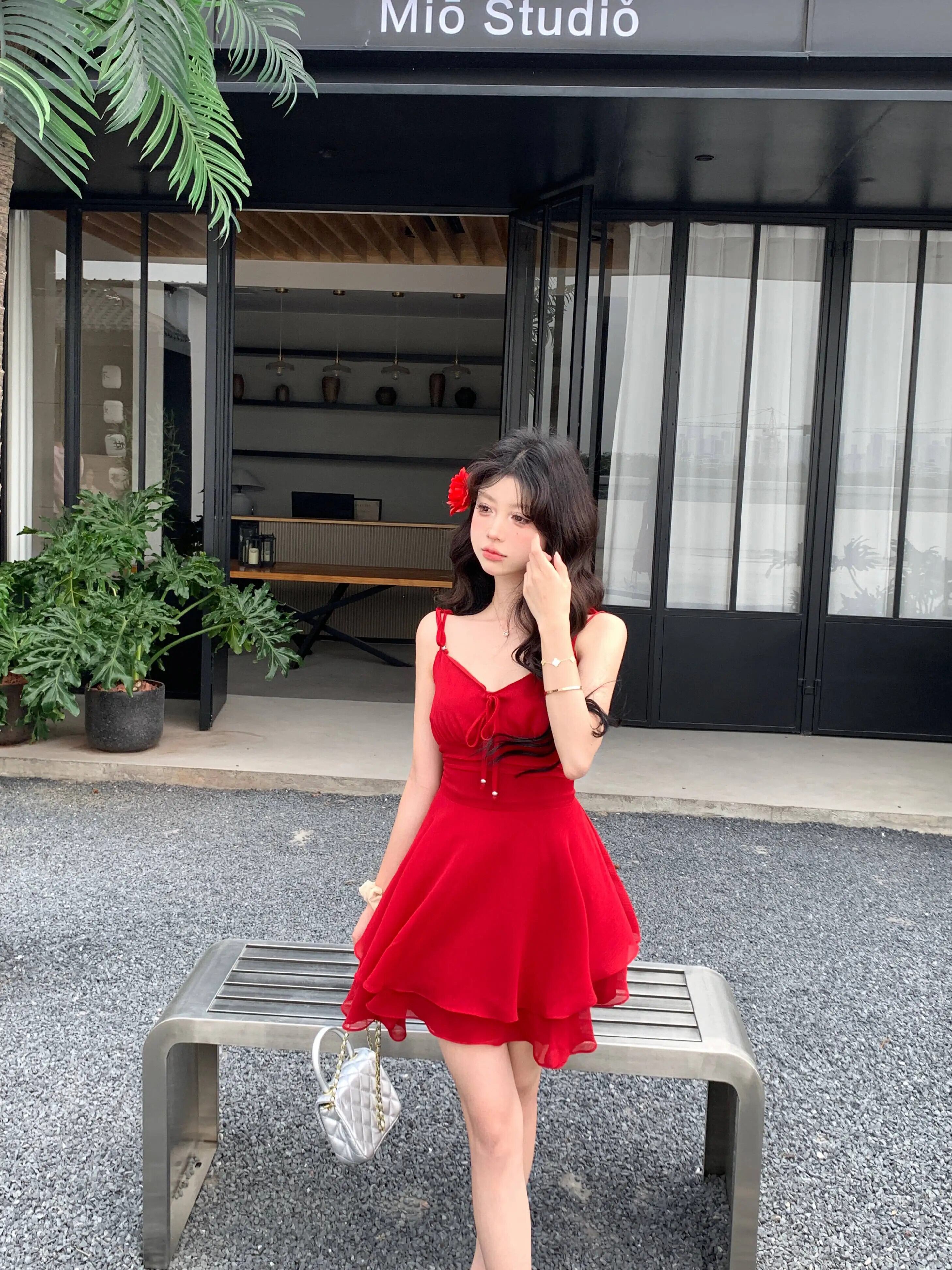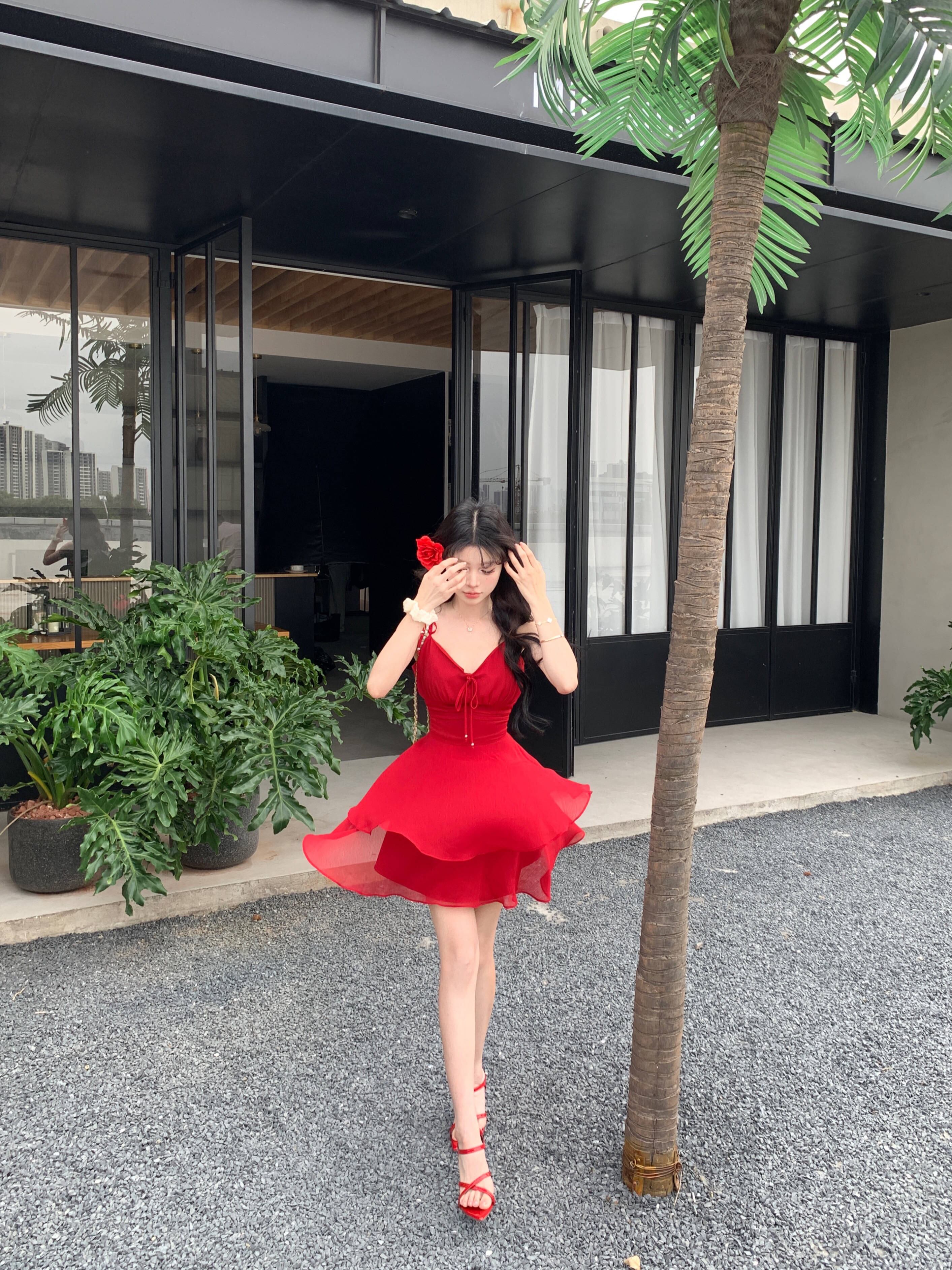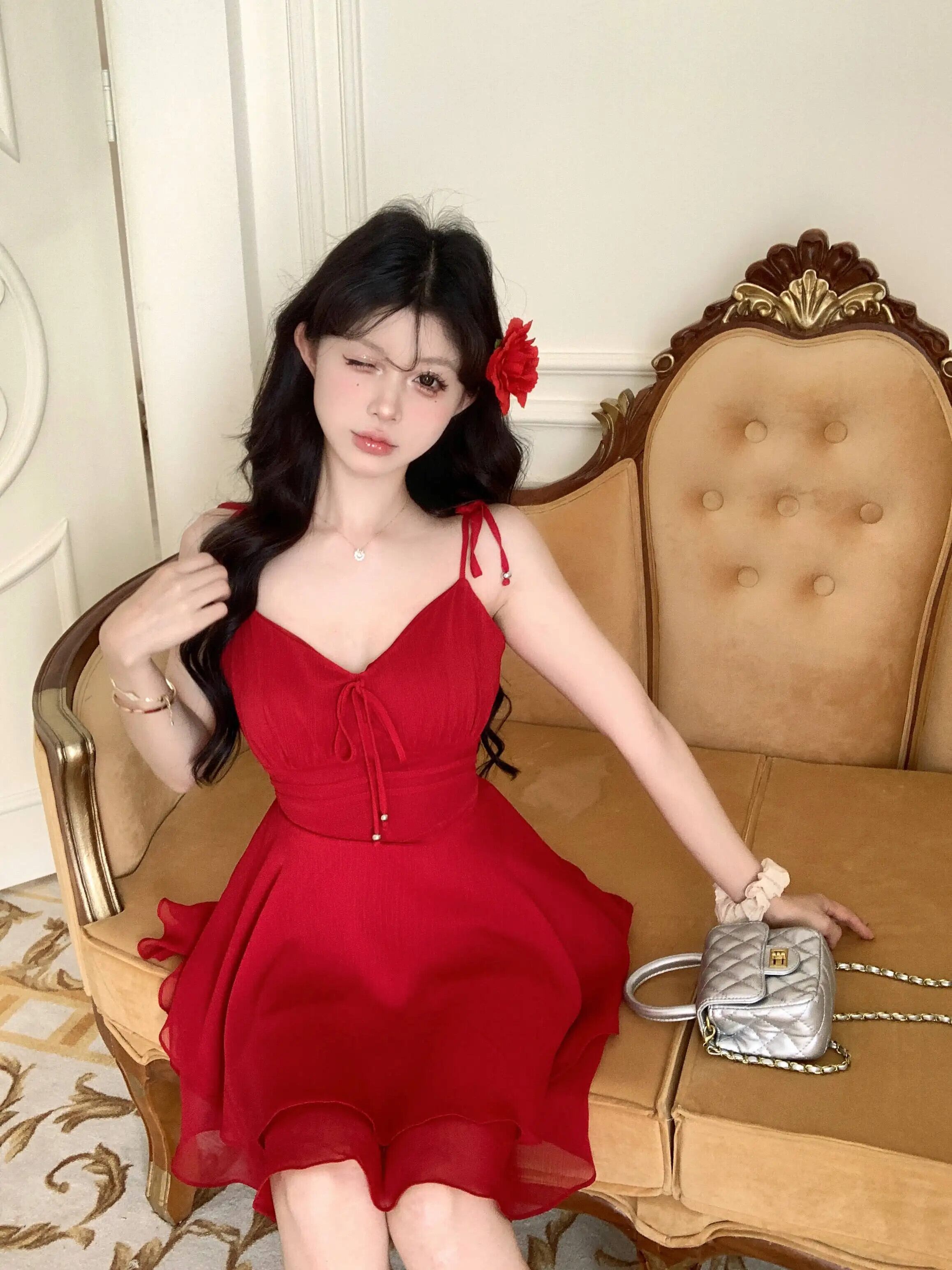 甘いホットガール純粋セクシー V ネックストラップドレス夏レッドレースアップスリムフィット A ラインショートドレス 大人ガーリー スウィート キュート カジュアル サマー 夏物 Vネック Aライン ピュア
