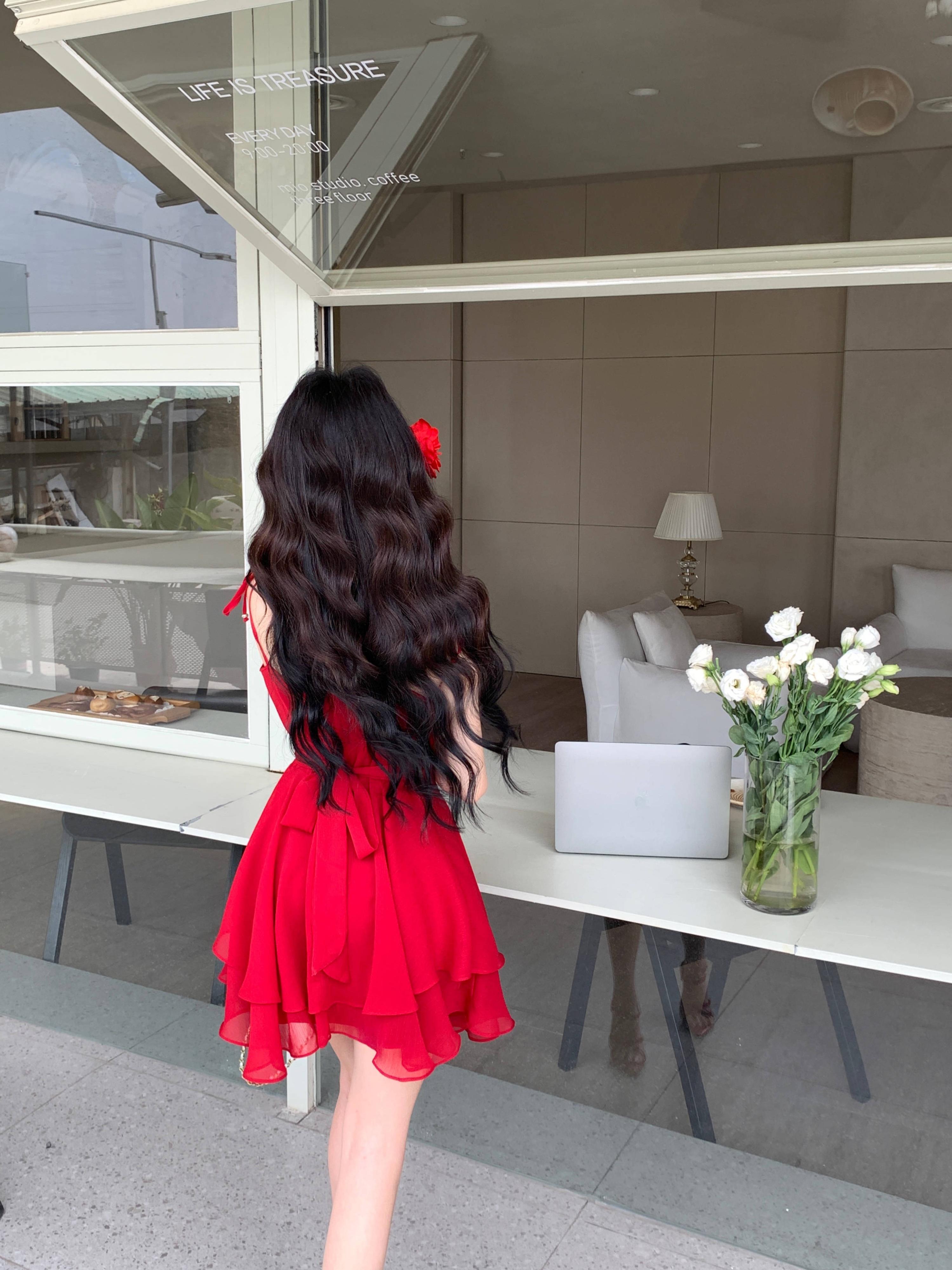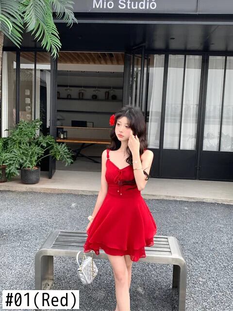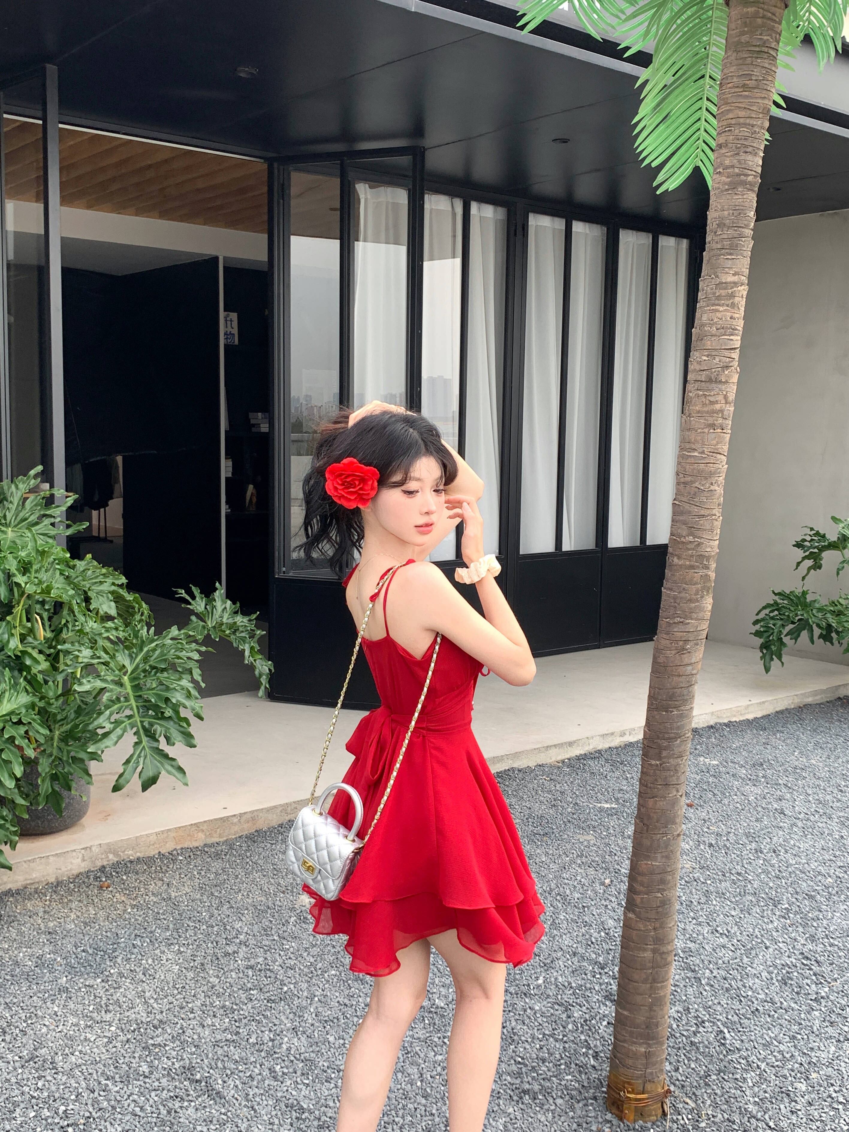甘いホットガール純粋セクシー V ネックストラップドレス夏レッドレースアップスリムフィット A ラインショートドレス 大人ガーリー スウィート キュート カジュアル サマー 夏物 Vネック Aライン ピュア