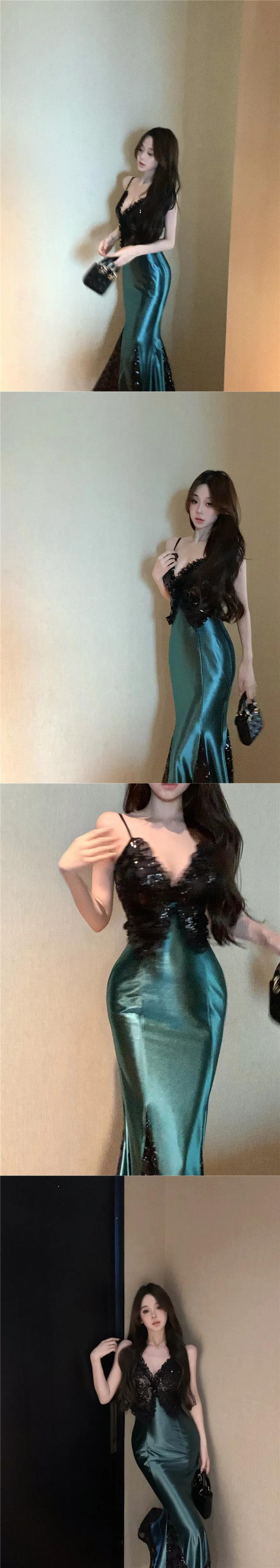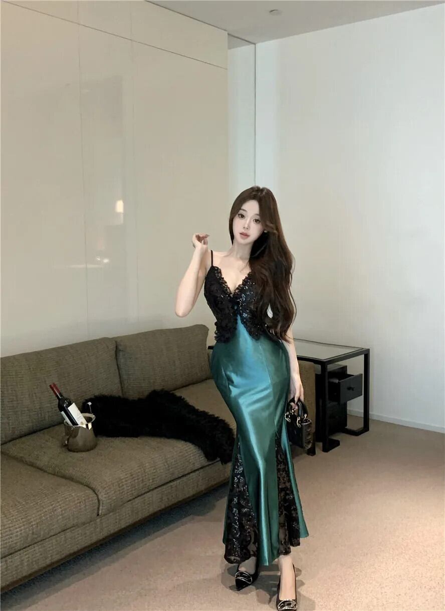 甘いホットガールセクシーサテンドレス冬スパンコール蝶レーススプライシングスリムフィットストラップロングドレス 大人ガーリー スウィート キュート カジュアル ウィンター 冬物