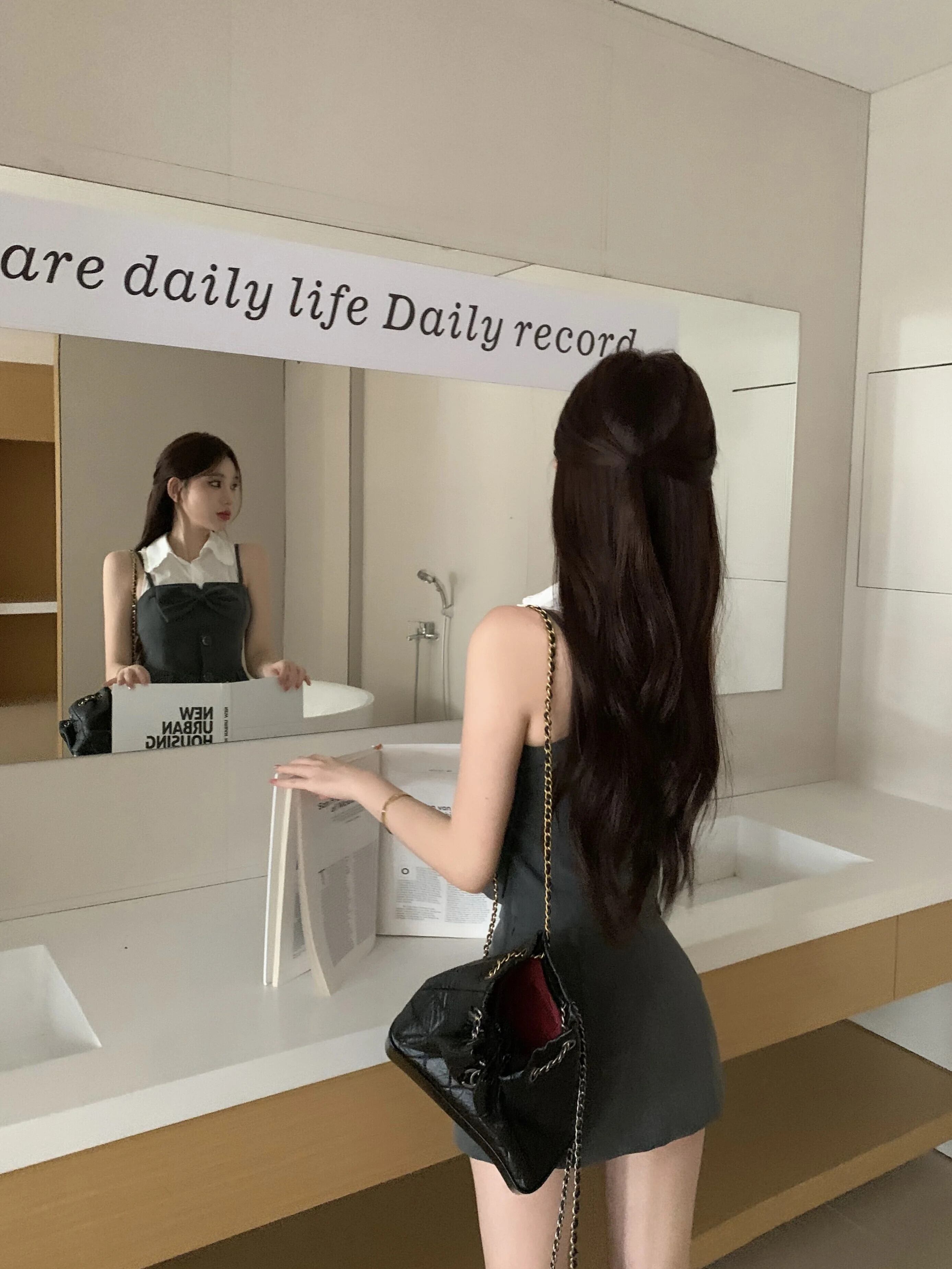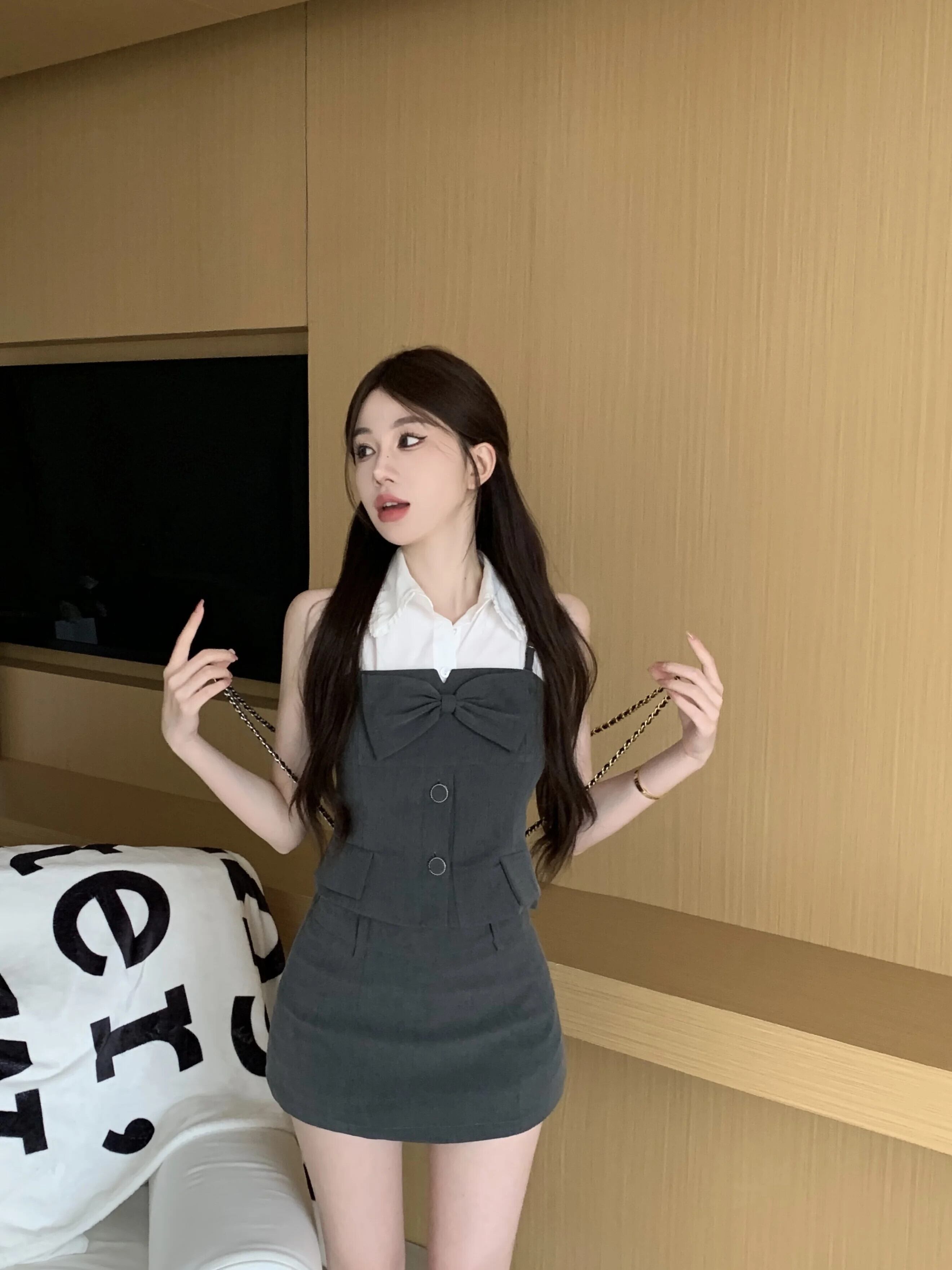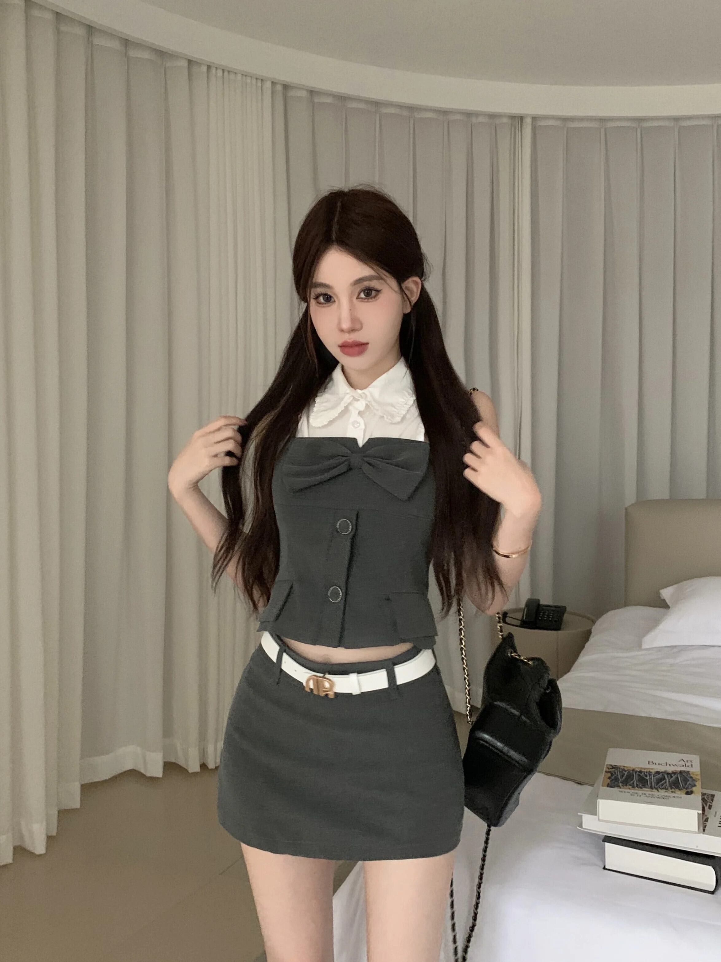 甘いホットガールスーツ春弓ストラップレスベストノースリーブシャツ A ラインミニスカート 3 点セット リボン 大人ガーリー スウィート キュート カジュアル スプリング 春物 Aライン