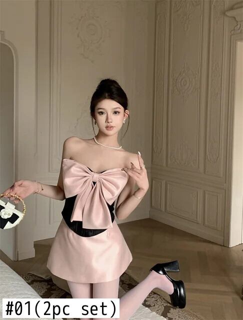 甘いホットガールセクシースーツ夏コントラストリボンストラップレスベストトップ A ラインミニスカート 2 点セット 大人ガーリー スウィート キュート カジュアル サマー 夏物 Aライン