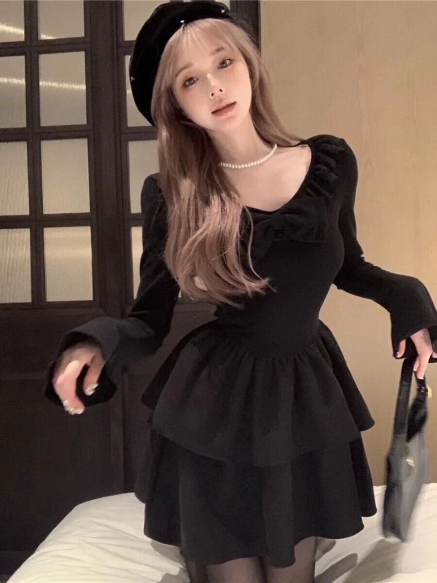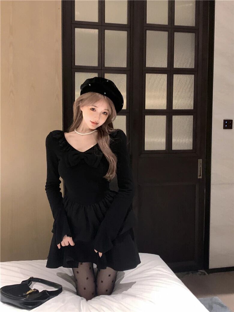 甘いホットガール黒弓長袖 V ネックドレス春スリムフィット A ラインふわふわショートドレス ロング ブラック リボン 大人ガーリー スウィート キュート カジュアル スプリング 春物 Vネック Aライン