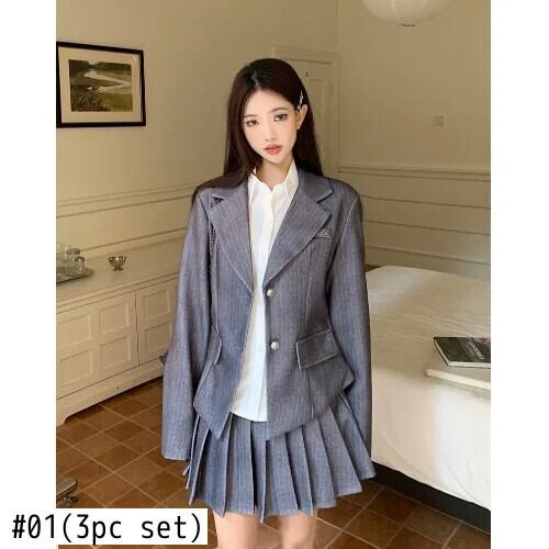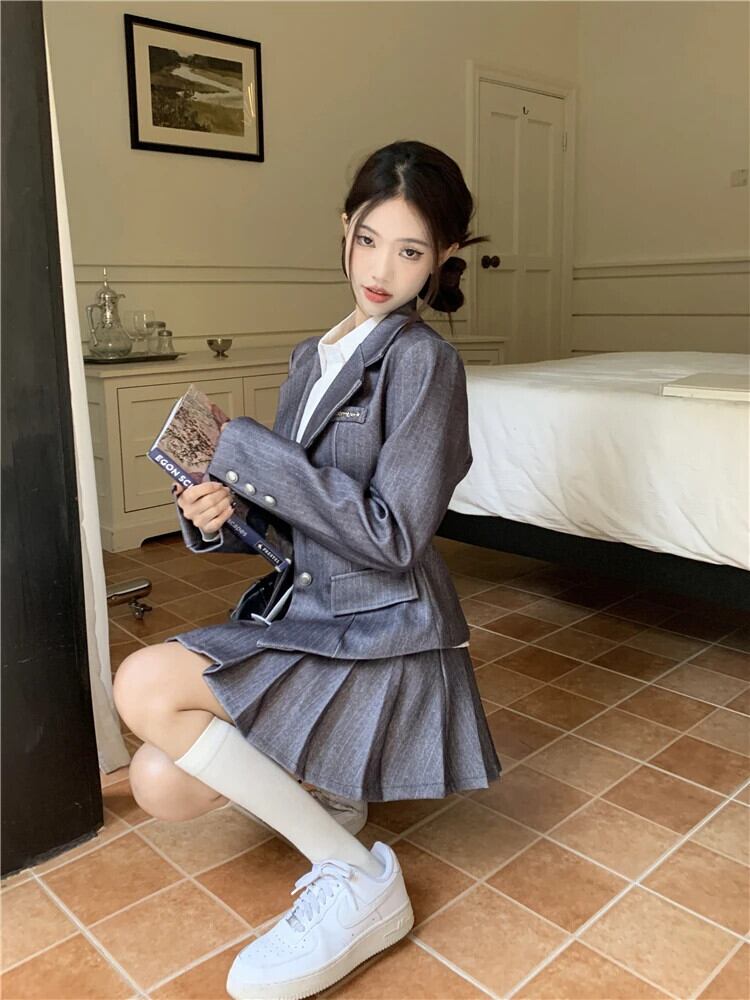 ホットガール プレッピー スタイル スーツ レディース 秋冬 テーラード コート 白シャツ A ライン プリーツ ショート スカート 3 点セット ホワイト レッド オータム 秋物 ウィンター 冬物 Aライン