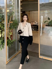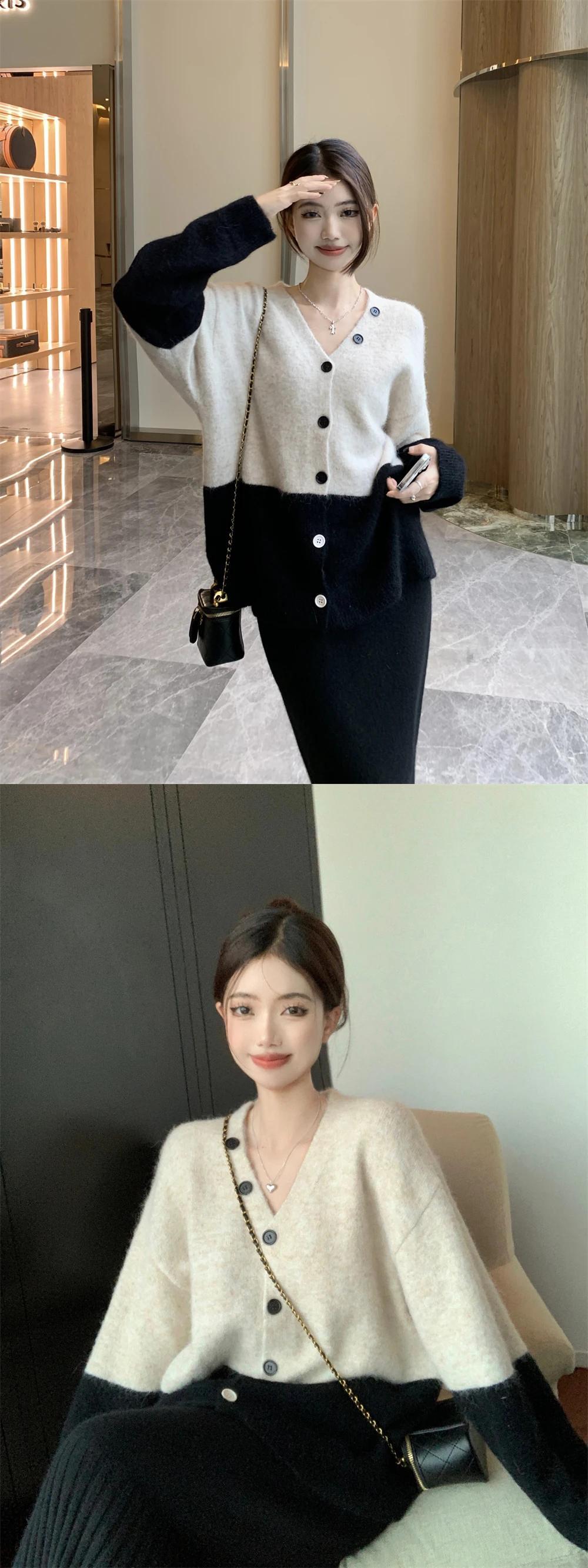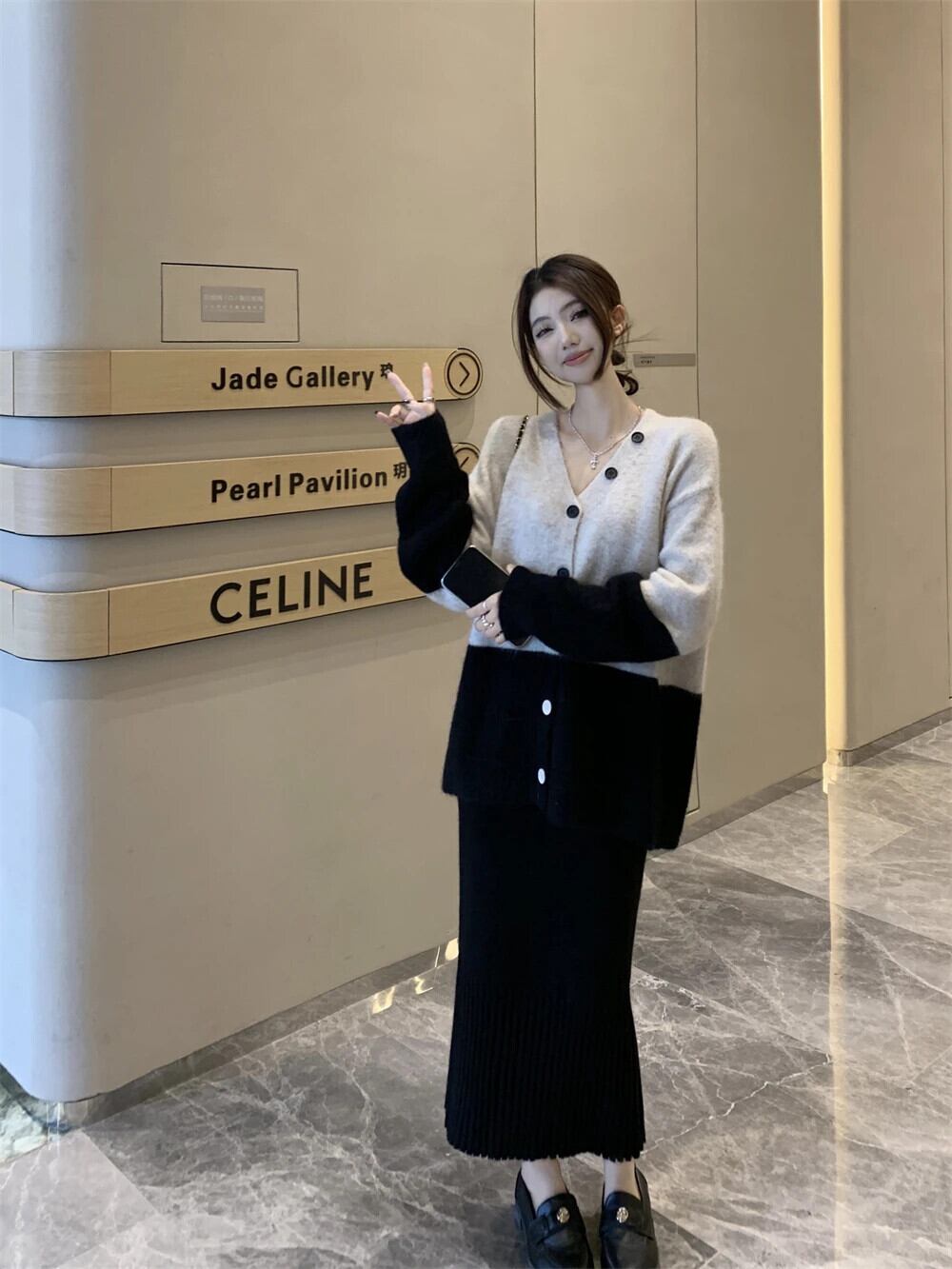 甘いホットガールスーツ春コントラスト V ネックセーターカーディガンニットロングスカート 2 点セット 大人ガーリー スウィート キュート カジュアル スプリング 春物 Vネック