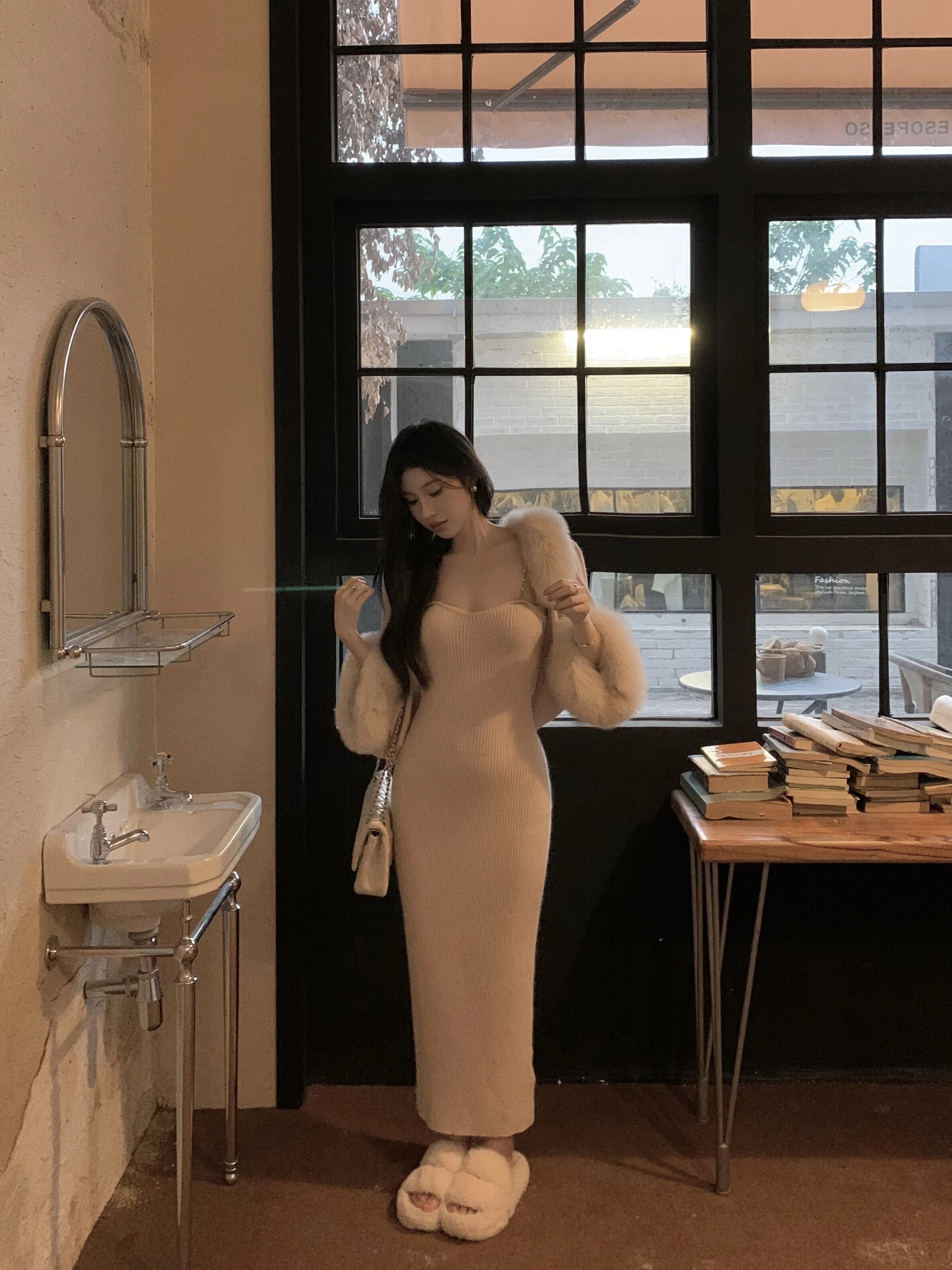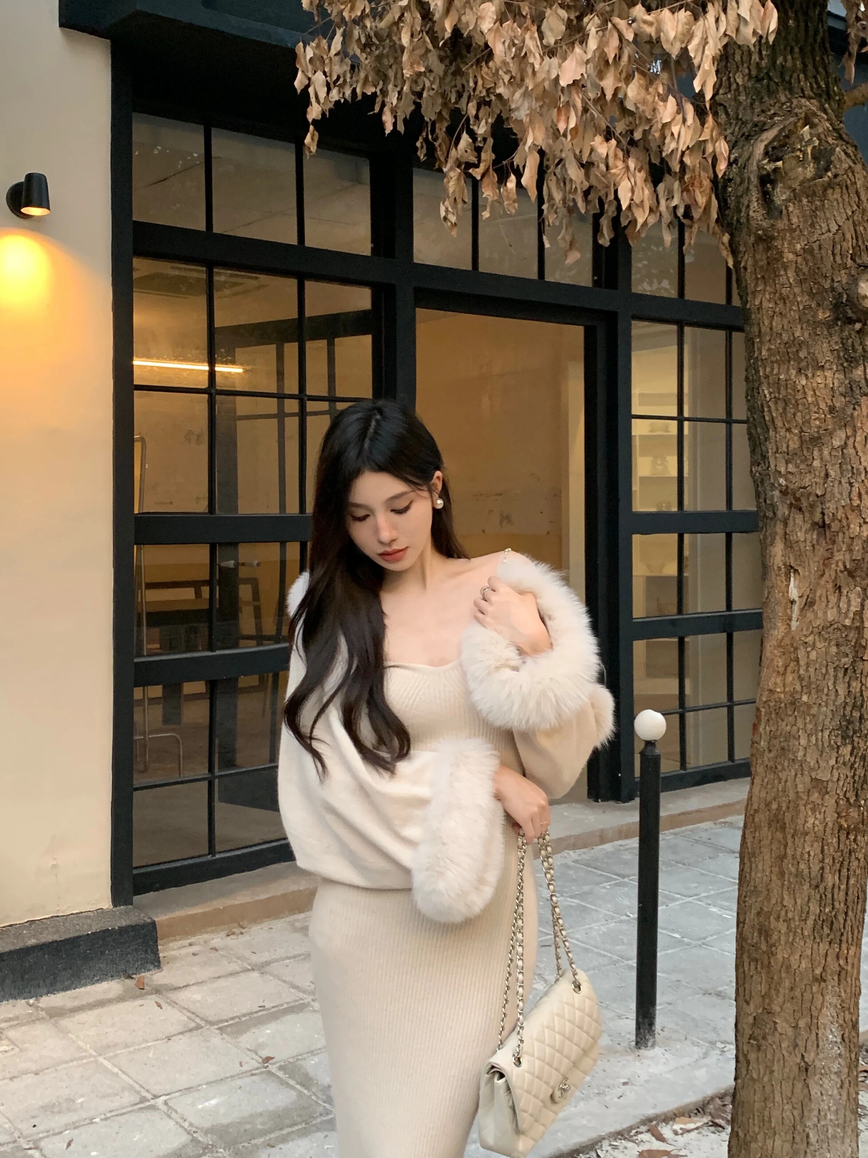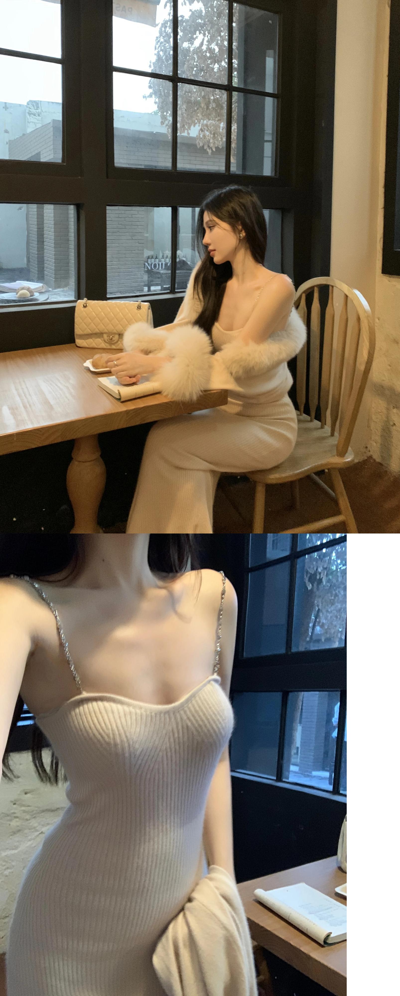 甘いホットガールセクシースーツ秋と冬長袖ショールジャケットチェーンドレスツーピースセット ロング 大人ガーリー スウィート キュート カジュアル オータム 秋物 ウィンター 冬物