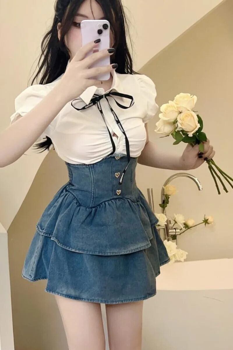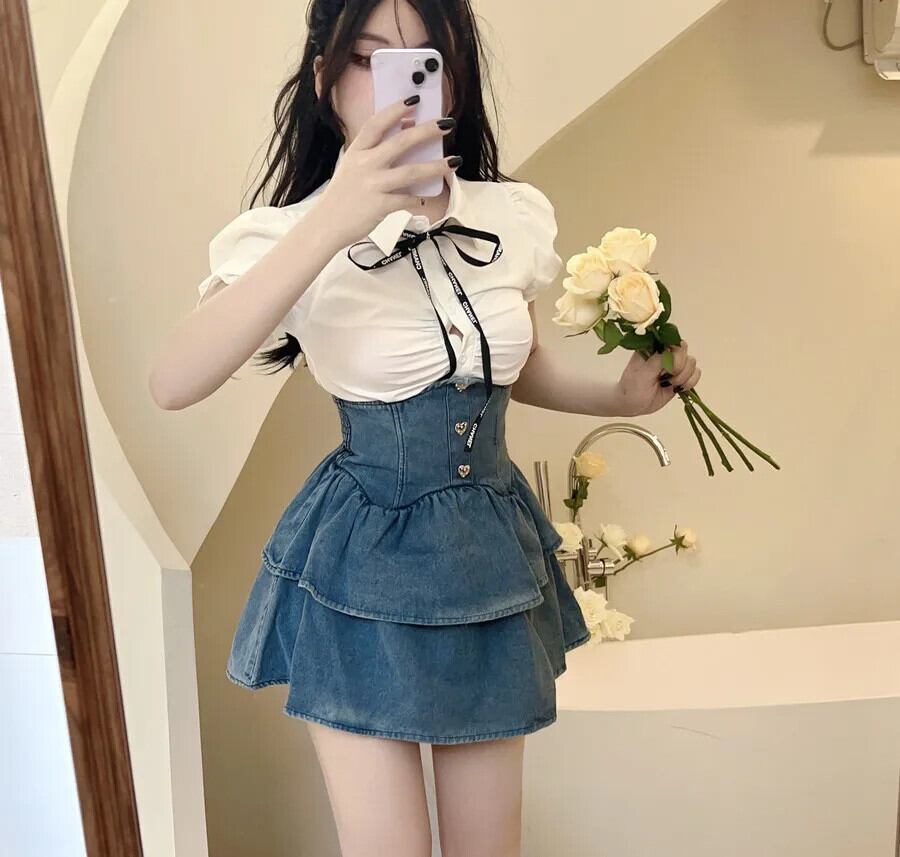 フレンチスイートホットガールプレッピースタイルスーツバブルスリーブレースアップ白シャツウエストふわふわデニムスカート2点セット ホワイト 大人ガーリー スウィート キュート カジュアル