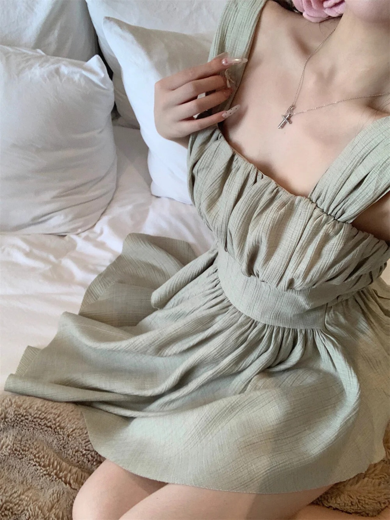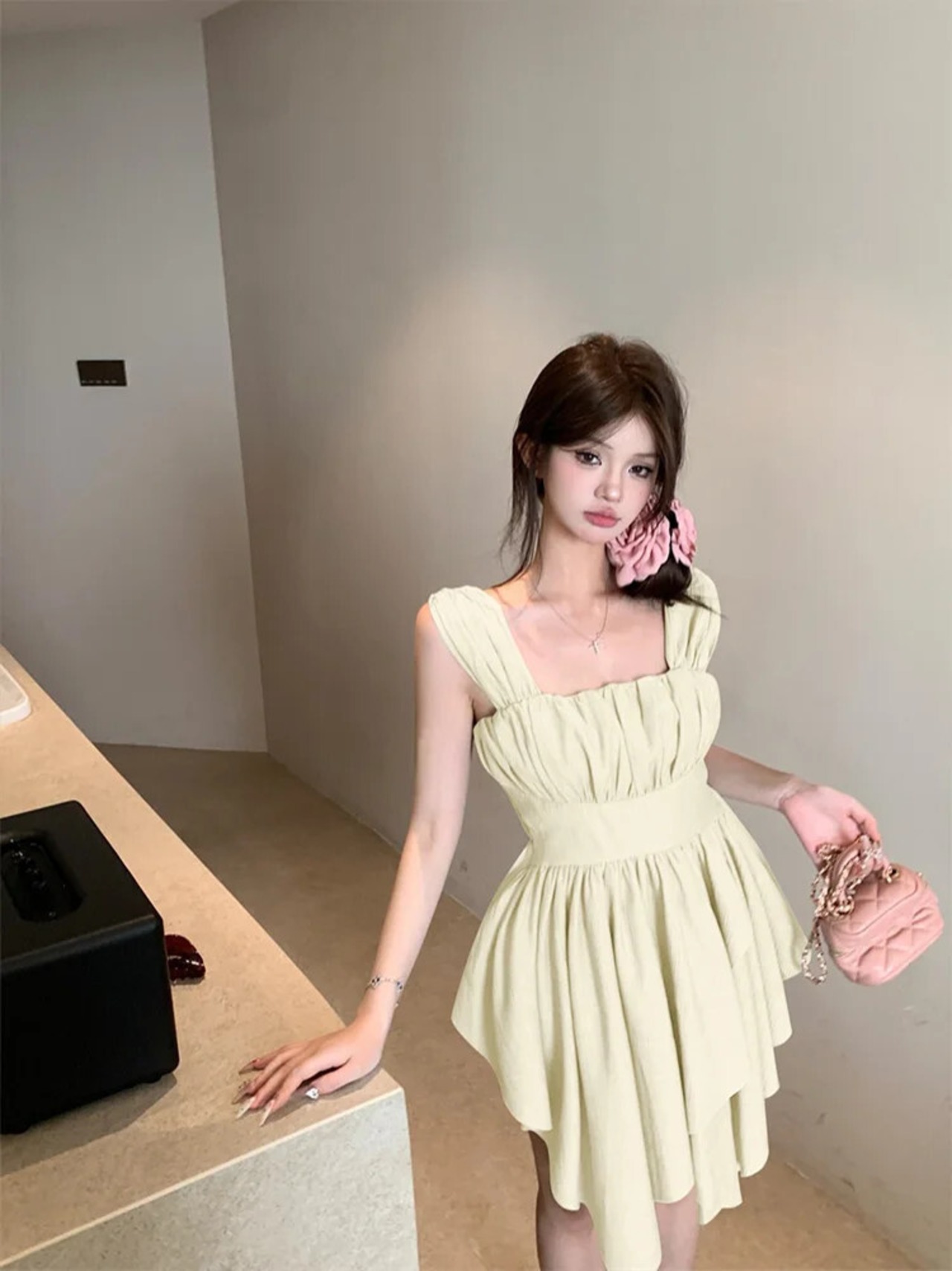 甘いホットガール純粋セクシーストラップドレス夏スクエアカラー不規則プリーツ A ラインショートドレス 大人ガーリー スウィート キュート カジュアル サマー 夏物 Aライン ピュア スクウェア