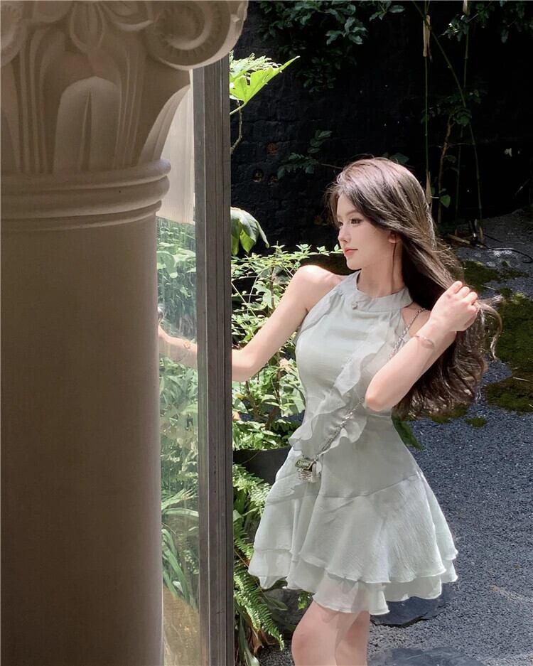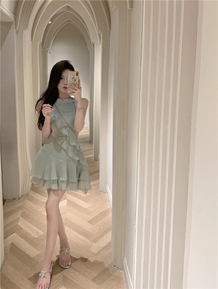 甘いホットガールフリルネックマウントドレス夏ビーチ休暇ノースリーブ A ラインショートドレス 大人ガーリー スウィート キュート カジュアル サマー 夏物 Aライン