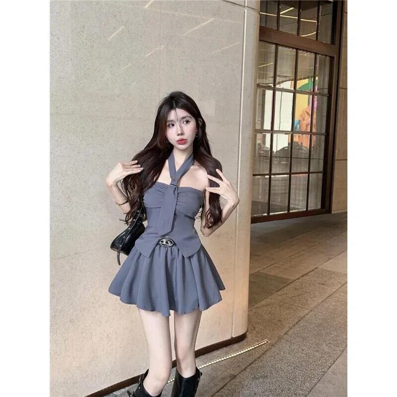 Sweet HotGirl 純粋セクシースーツ夏スリムフィットホルターネックタンクトップウエストプリーツショートスカート 2 点セット 大人ガーリー スウィート キュート カジュアル サマー 夏物 ピュア