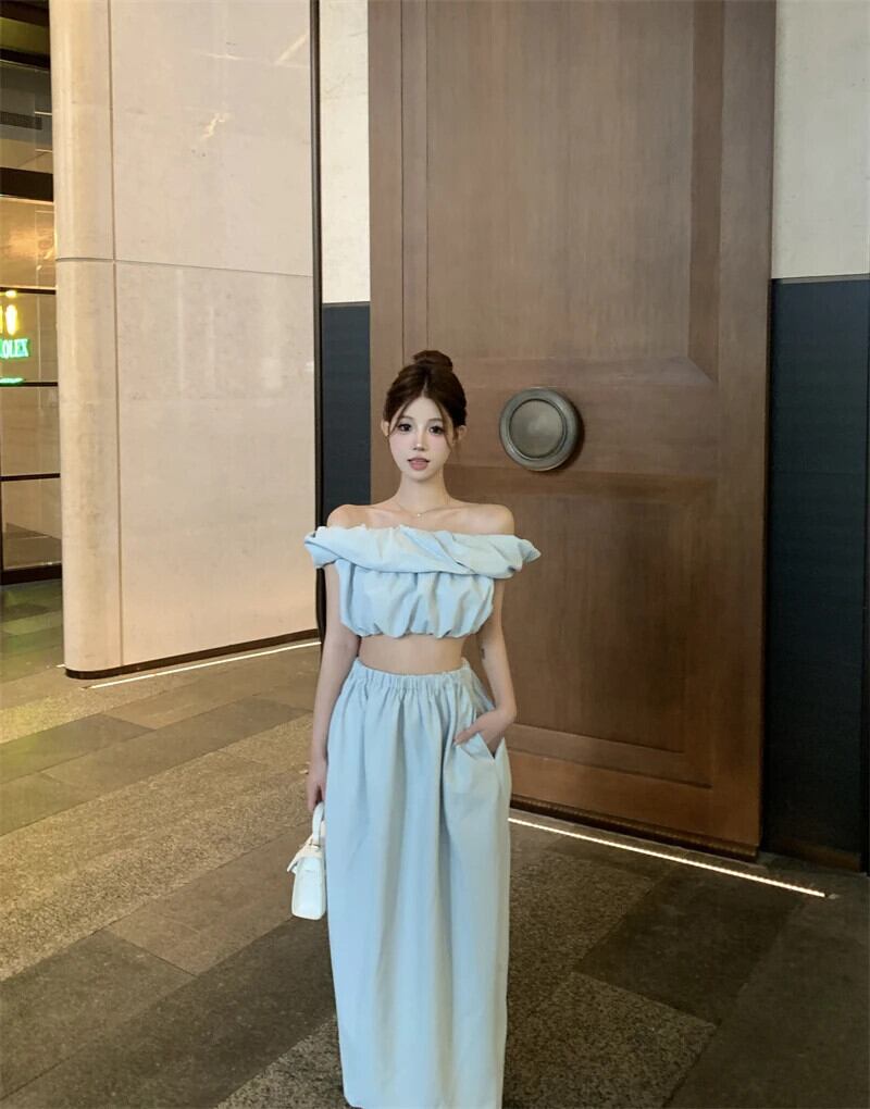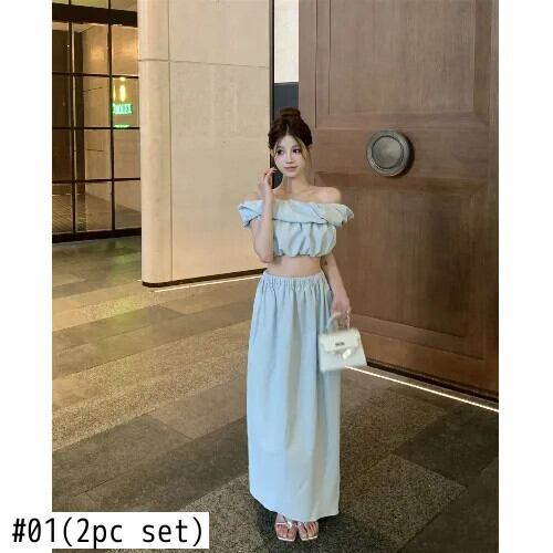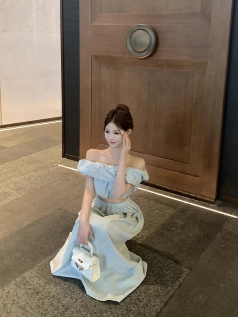 甘いホットガールスーツ夏オフショルダーシャツウエスト A ラインロングスカート 2 点セット 大人ガーリー スウィート キュート カジュアル サマー 夏物 Aライン