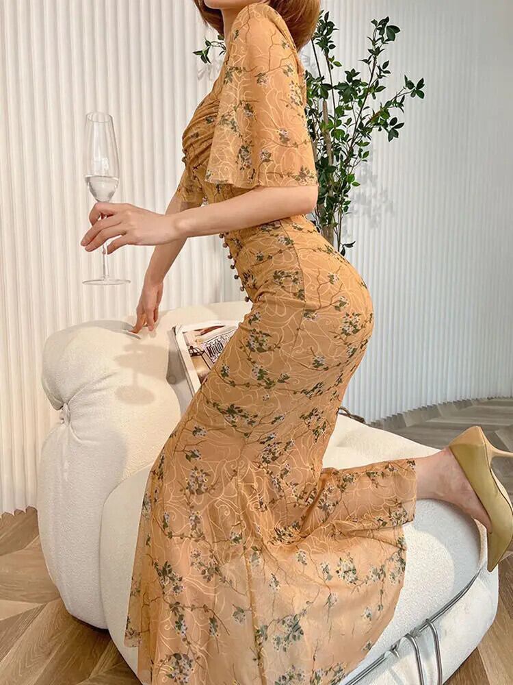 甘いホットガールドレス春花柄スクエアカラースリムフィット臀部ラップマーメイドドレス 大人ガーリー スウィート キュート カジュアル スプリング 春物 スクウェア