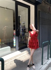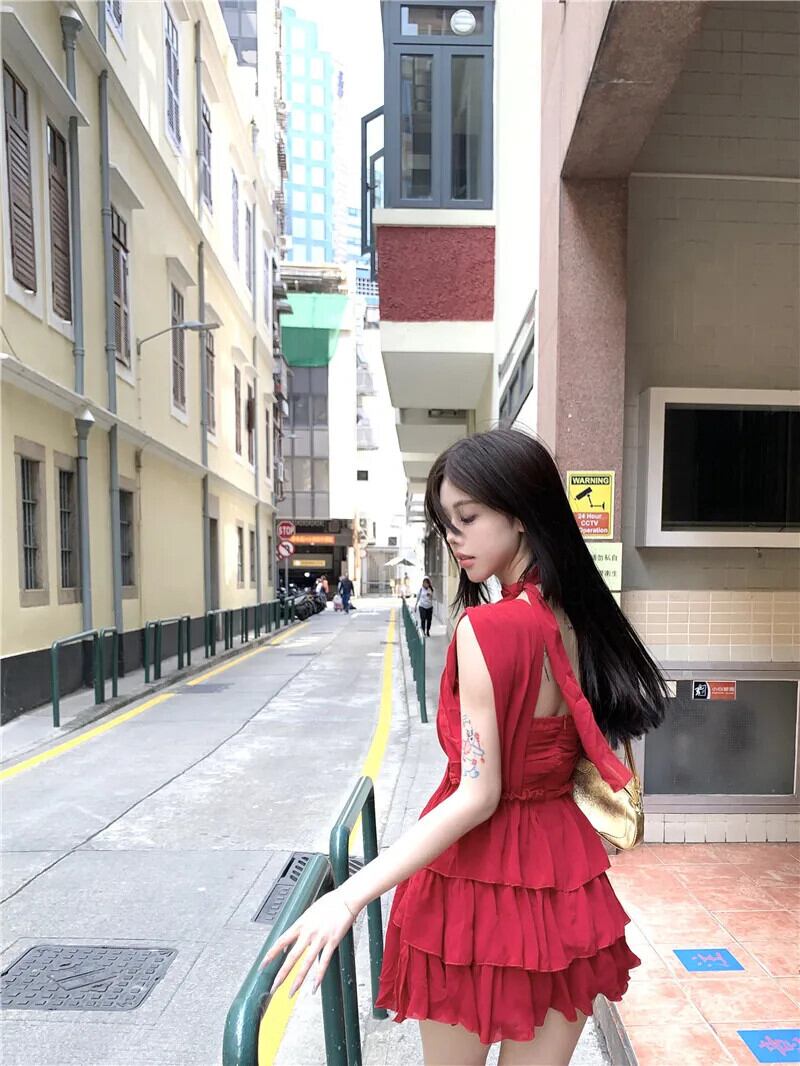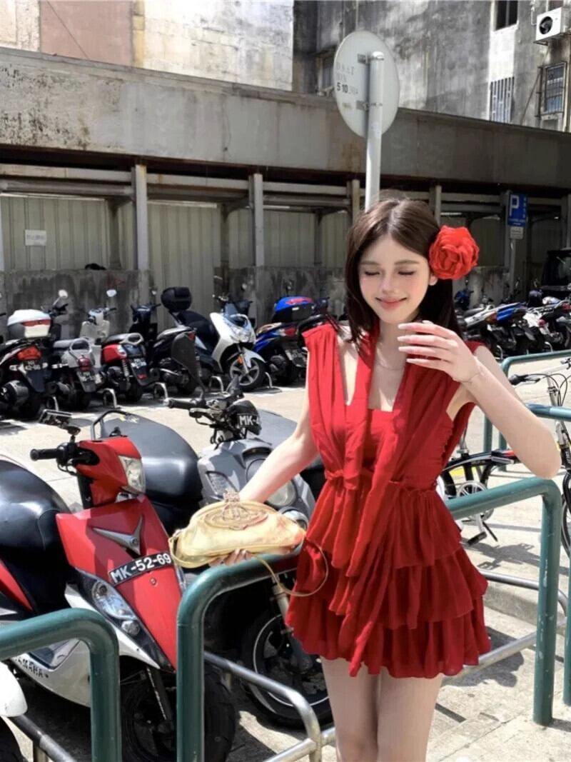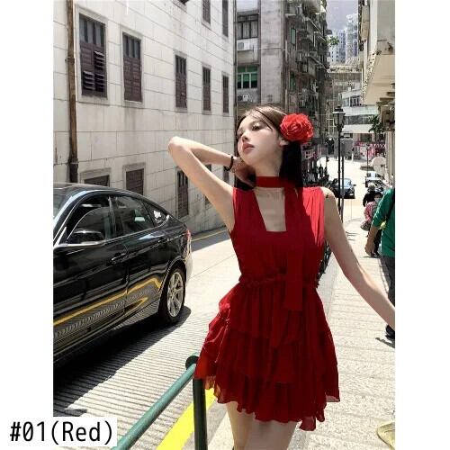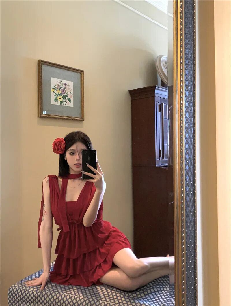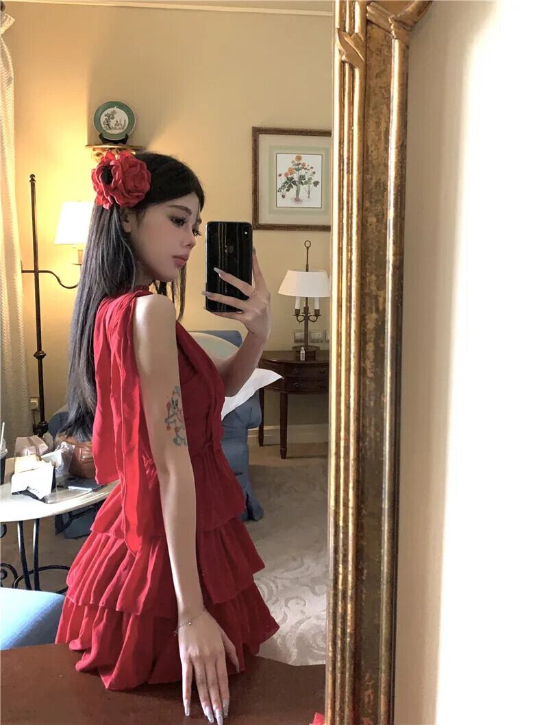 甘いホットガール赤バックレスストラップドレス夏レトロスクエアカラースリムフィット A ラインショートドレス レッド 大人ガーリー スウィート キュート カジュアル サマー 夏物 Aライン スクウェア