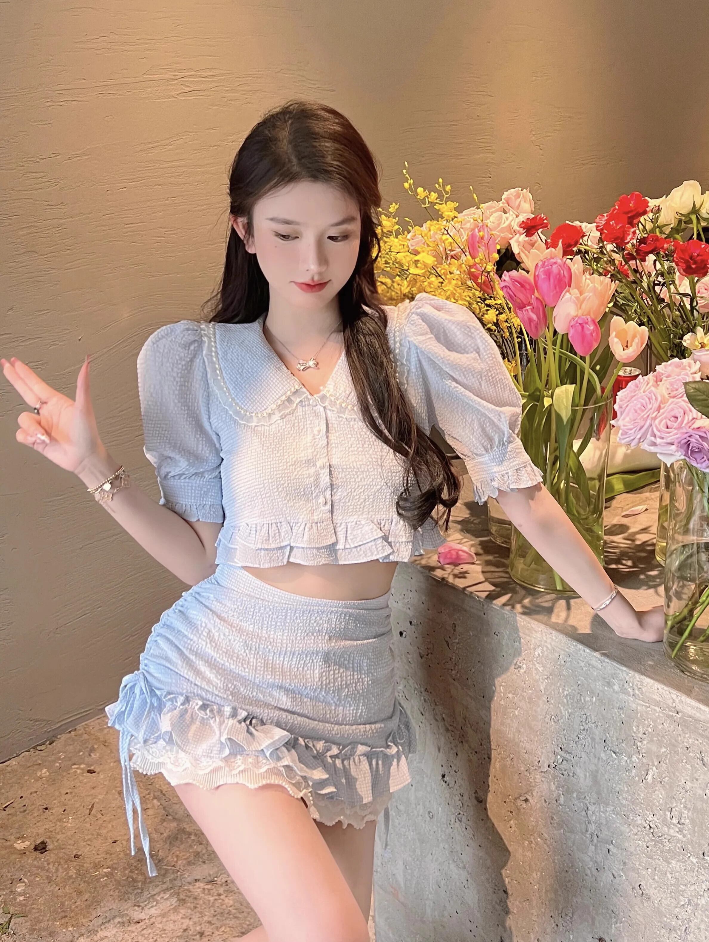 スイートホットガールスーツ レディース 夏 ピーターパンカラー スリムフィット 半袖トップ ウエストミニスカート 2点セット 大人ガーリー スウィート キュート カジュアル サマー 夏物