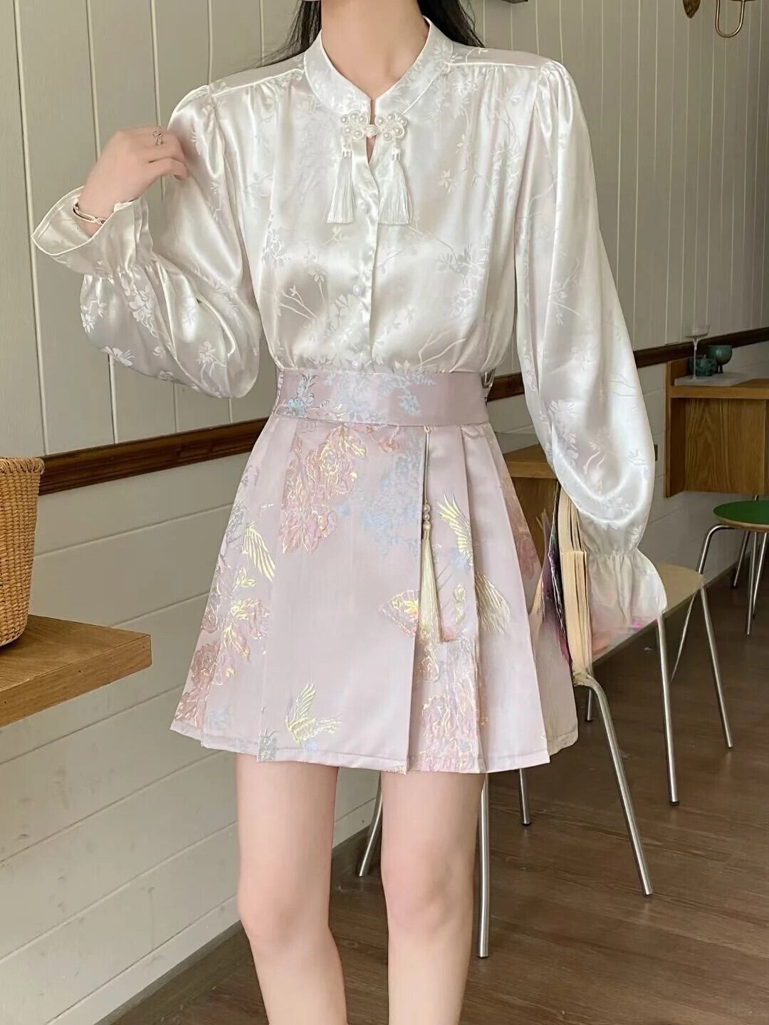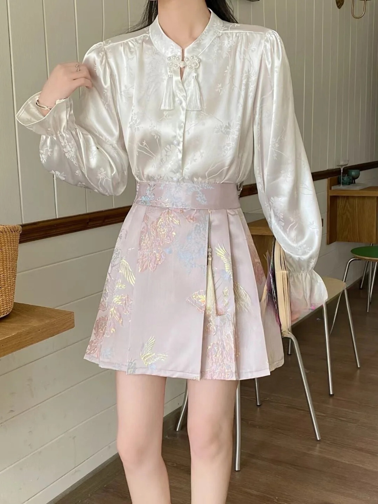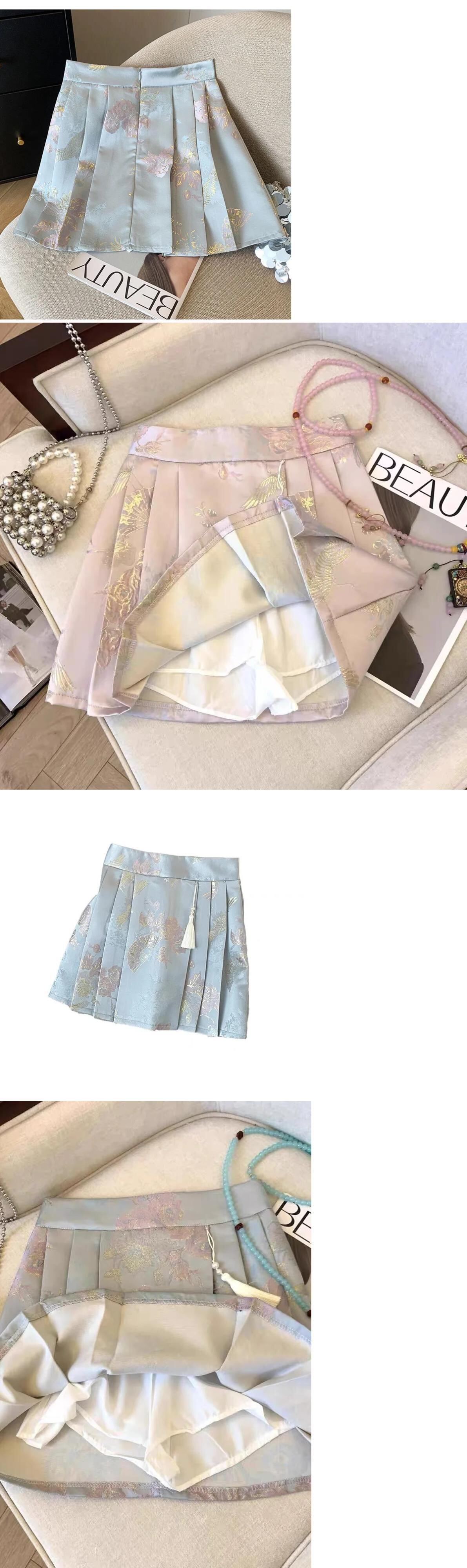 ホットガール中国風ジャカード刺繍スカート夏ウエストプリーツ A ラインショートスカート レッド サマー 夏物 Aライン