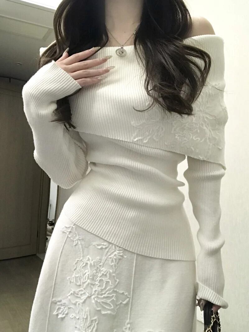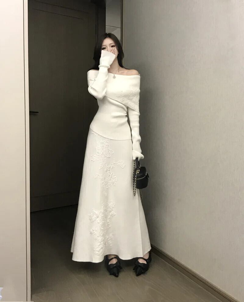 甘いホットガールニットスーツ春オフショルダーセーターウエストミニスカートツーピースセット 大人ガーリー スウィート キュート カジュアル スプリング 春物