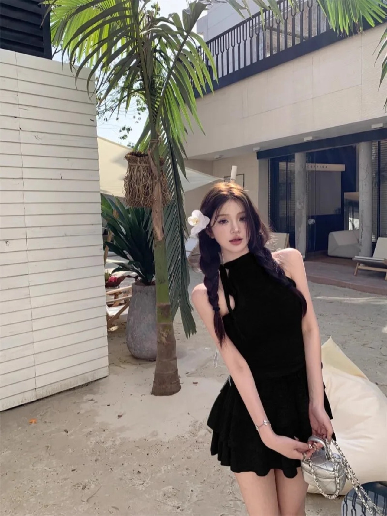 純粋セクシーホットガールスーツ夏ノースリーブホルターネックレースアップタンクトップウエスト A ラインスカート 2 点セット サマー 夏物 Aライン