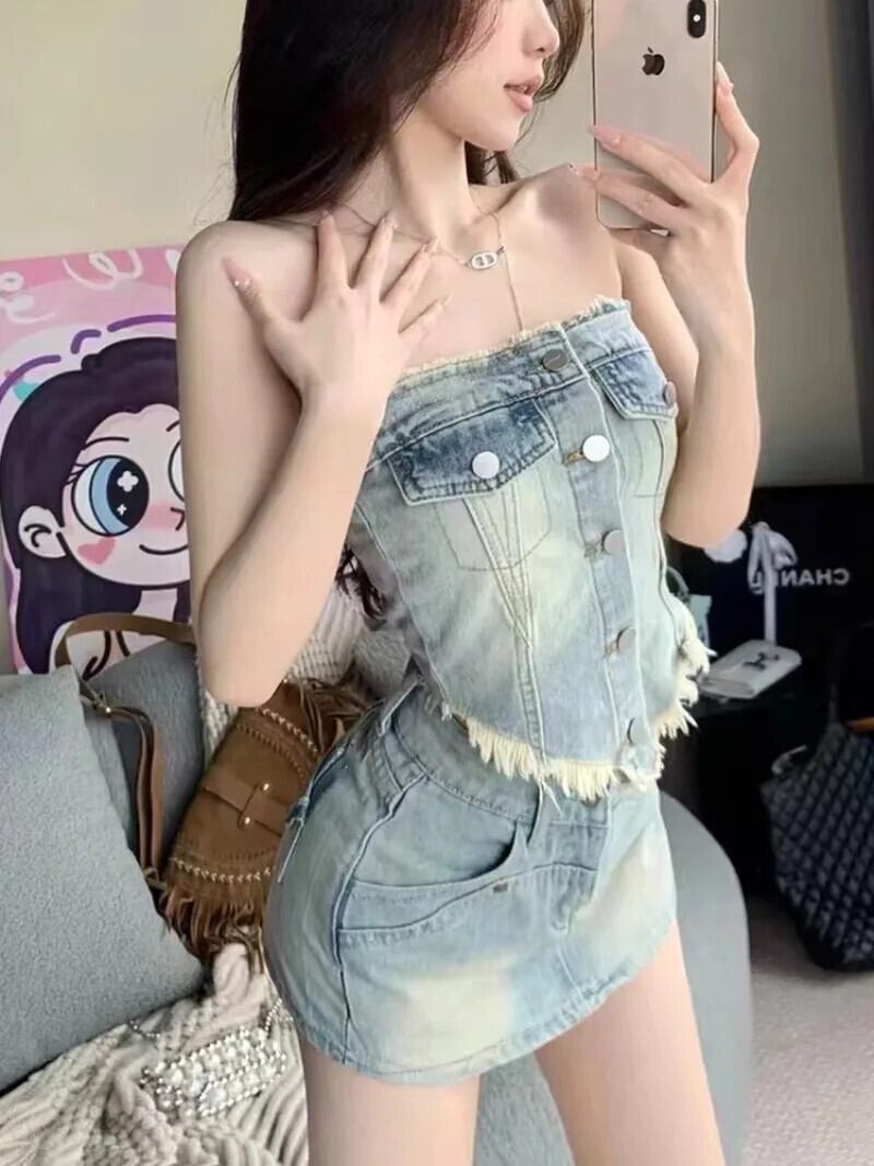 甘いホットガールレトロスーツ春夏ウォッシュデニムストラップレストップウエストスカートツーピースセット 大人ガーリー スウィート キュート カジュアル スプリング 春物 サマー 夏物