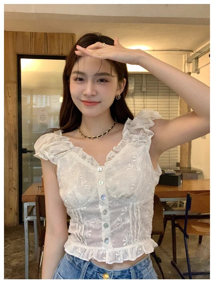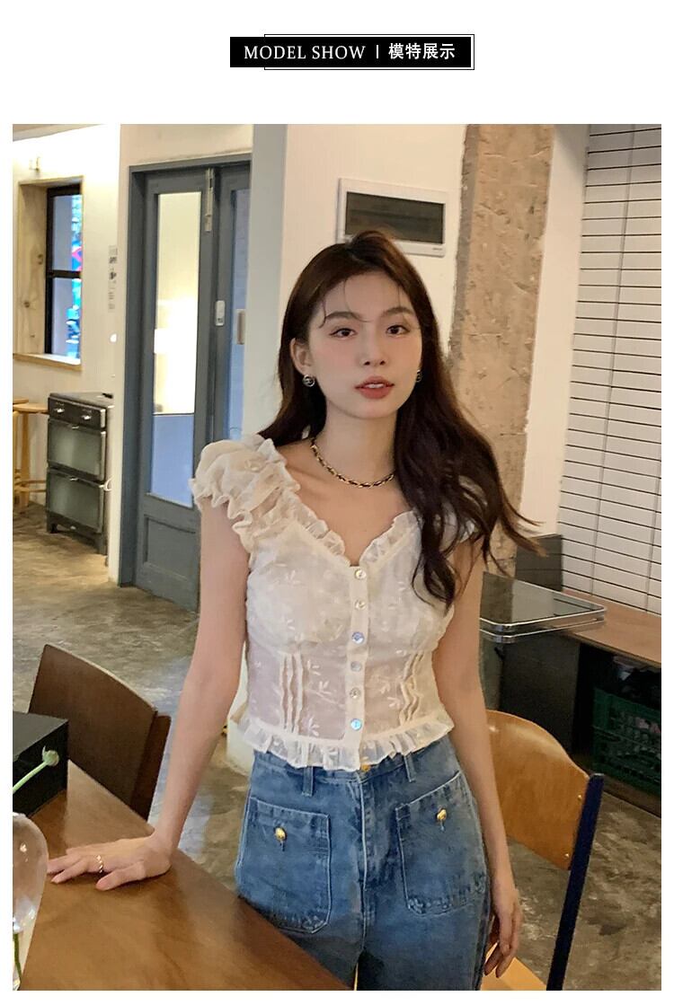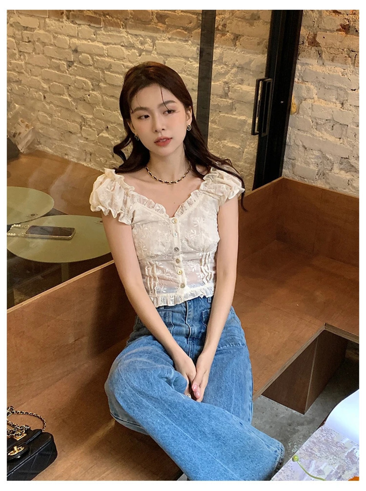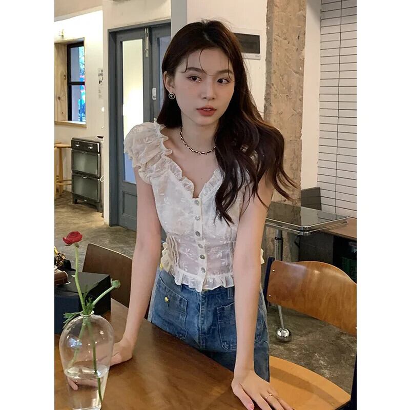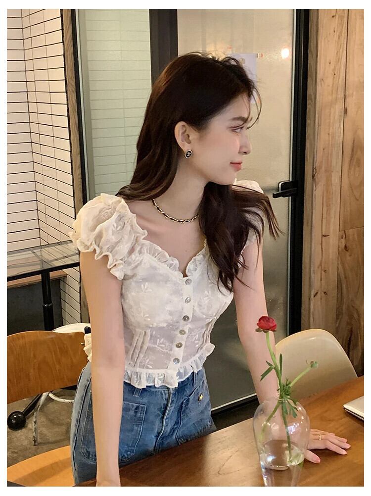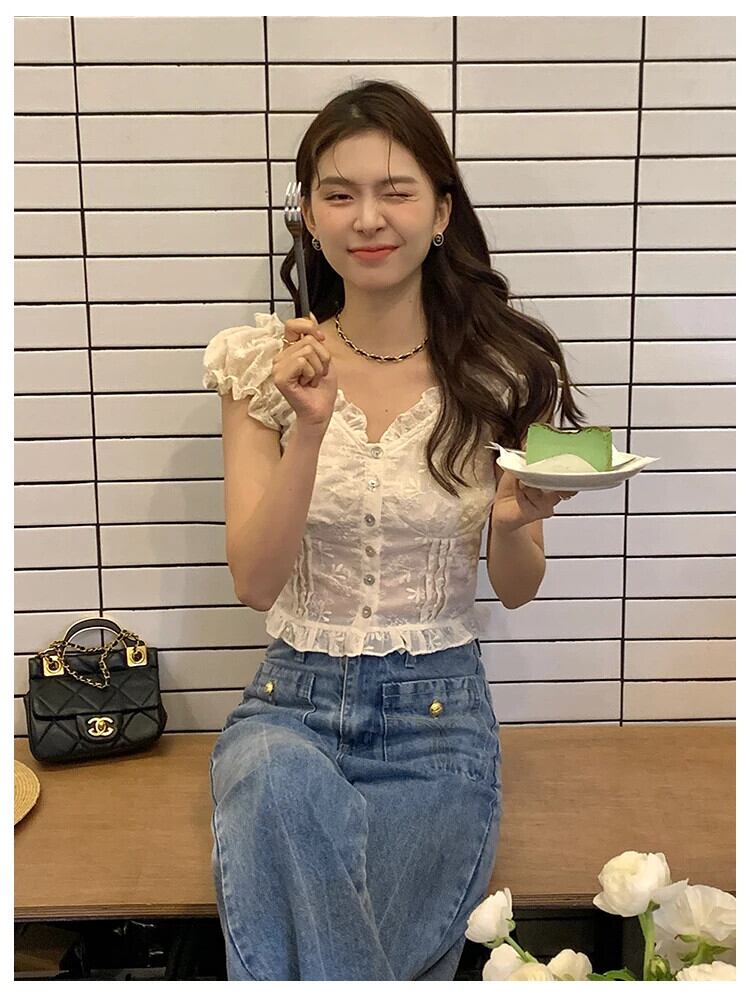 甘いホットガールソリッドカラーフリル刺繍トップ夏 V ネック半袖シフォンシャツ レッド 大人ガーリー スウィート キュート カジュアル サマー 夏物 Vネック