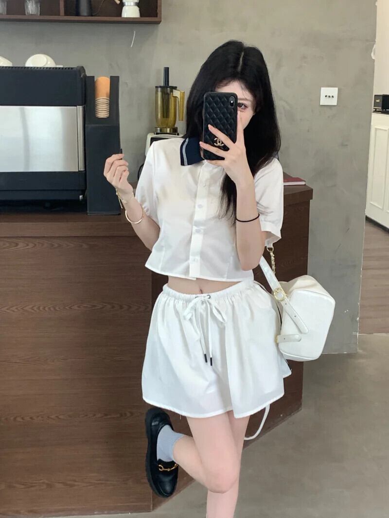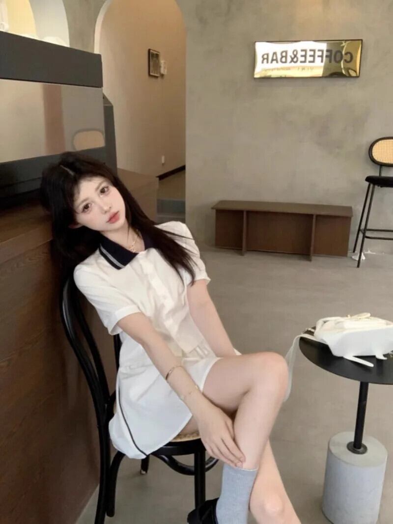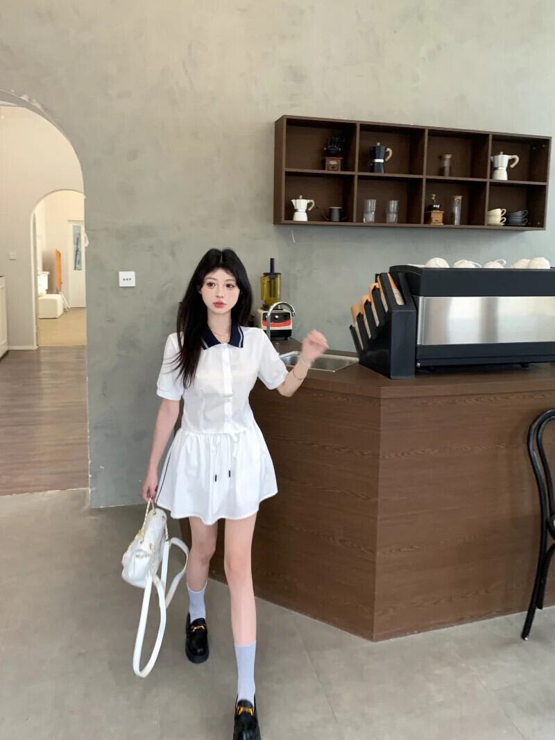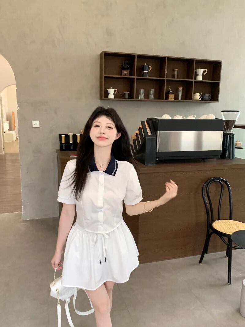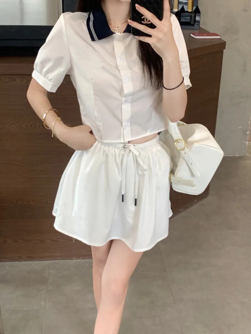 甘いホットガールスタイルスーツ夏コントラストあるポロネック半袖シャツ弾性ウエストスカート 2 点セット エラスティック 伸縮 大人ガーリー スウィート キュート カジュアル サマー 夏物 Oネック