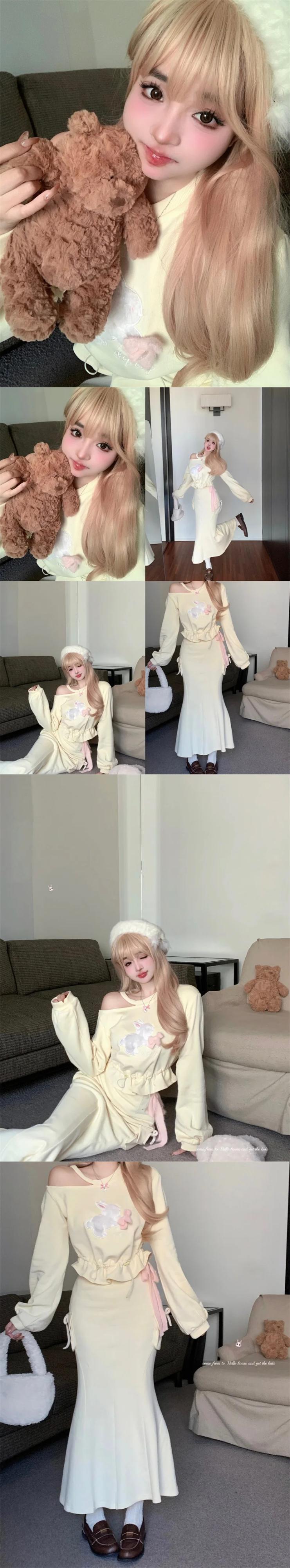 スイートホットガールスーツ レディース 秋冬 ウサギ刺繍 オフショルダー 長袖トップ マーメイドロングスカート 2点セット 大人ガーリー スウィート キュート カジュアル オータム 秋物 ウィンター 冬物