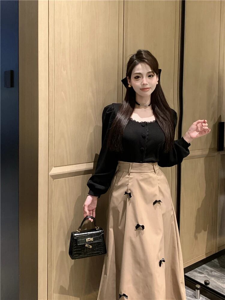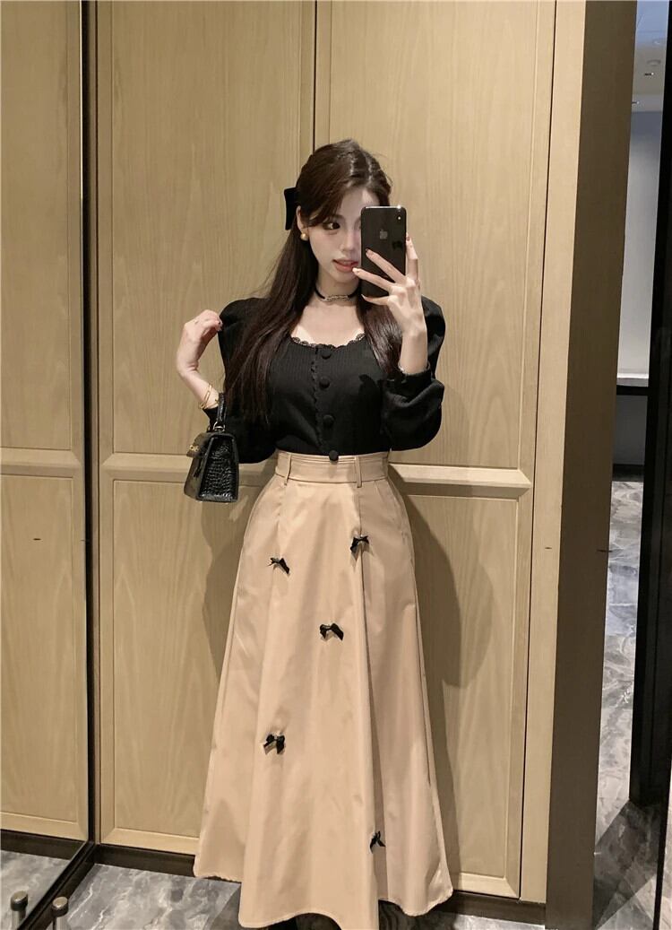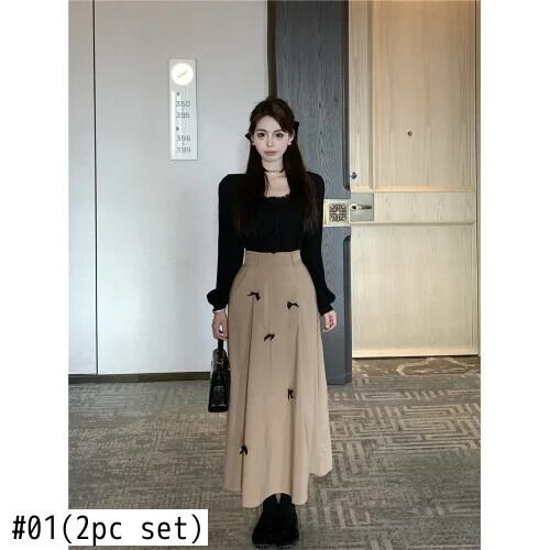甘いホットガールスーツ冬レースレース U ネックニットトップリボンロングスカート 2 点セット 大人ガーリー スウィート キュート カジュアル ウィンター 冬物