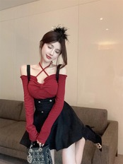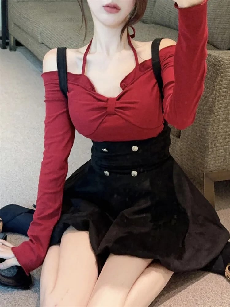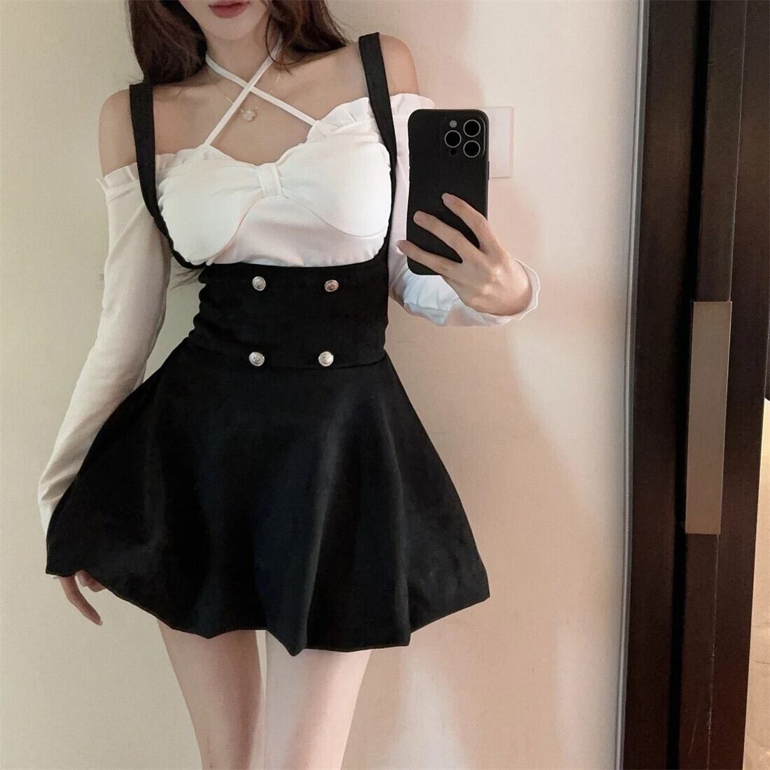スイートホットガールスーツ秋と冬ホルターネック長袖シャツストラップドレスツーピースセット ロング 大人ガーリー スウィート キュート カジュアル オータム 秋物 ウィンター 冬物