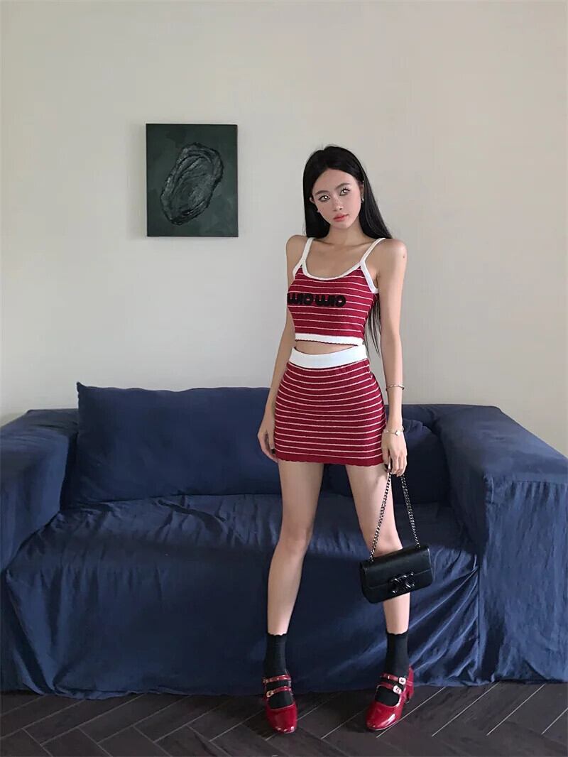 甘いホットガールスーツ春夏ニットストライプレターキャミソールトップウエストミニスカート 2 点セット 大人ガーリー スウィート キュート カジュアル スプリング 春物 サマー 夏物