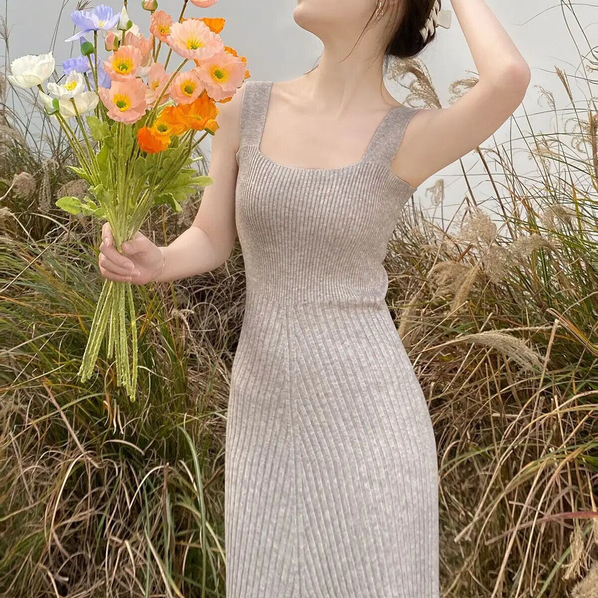 甘いホットガールセクシースリムフィットニットストラップドレス春ノースリーブスクエアカラーロングドレス 大人ガーリー スウィート キュート カジュアル スプリング 春物 スクウェア