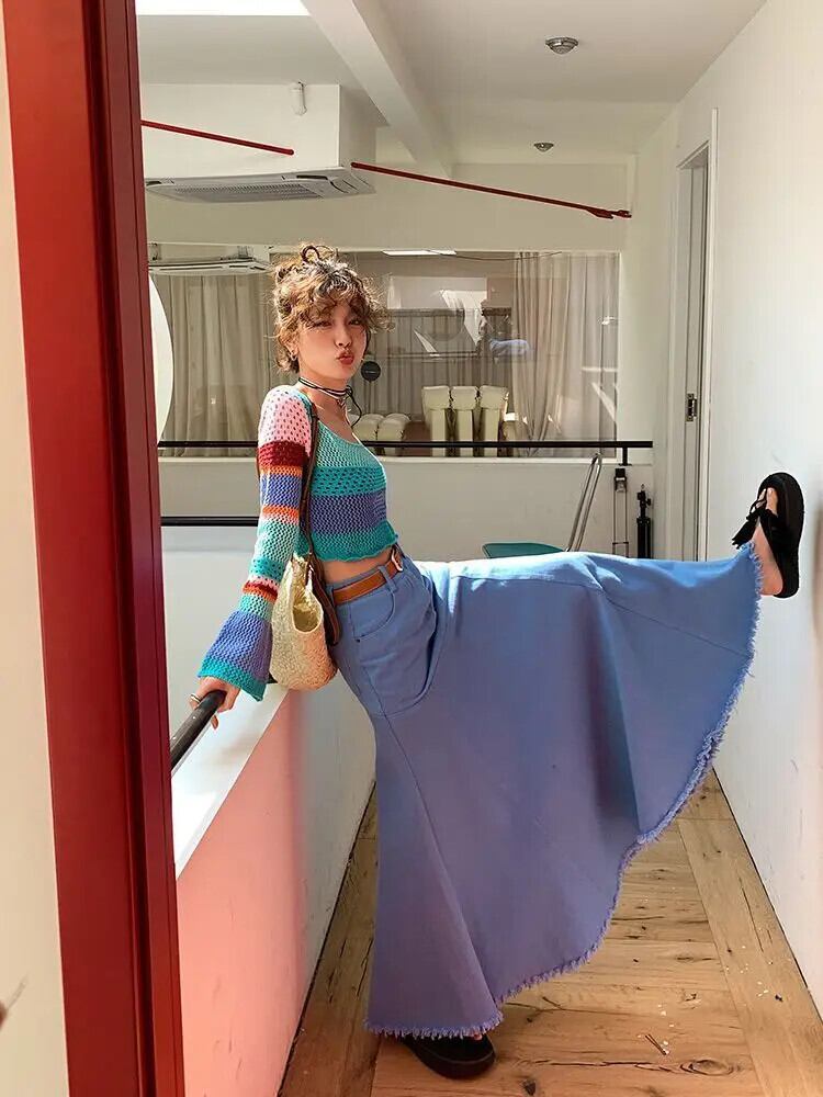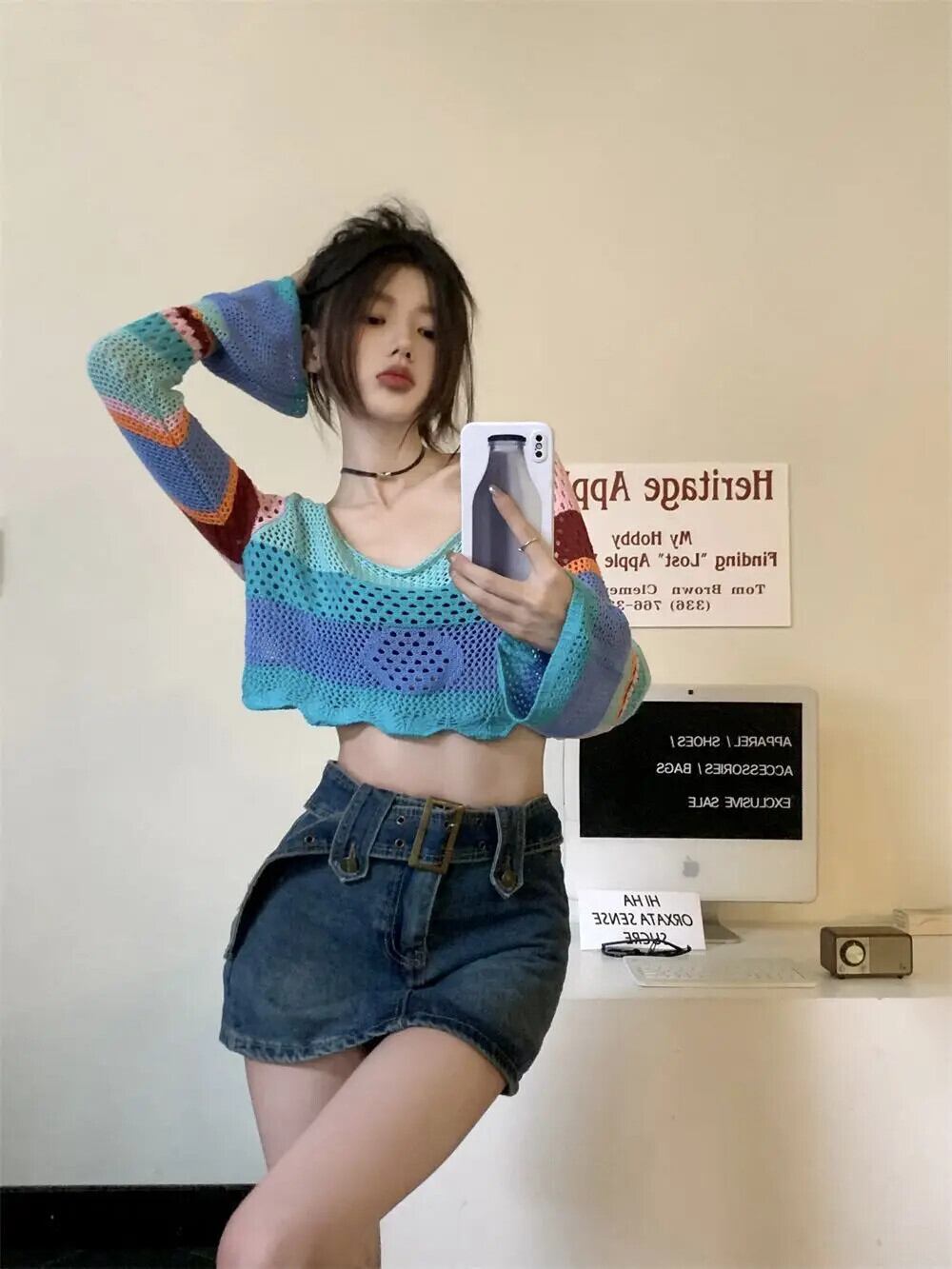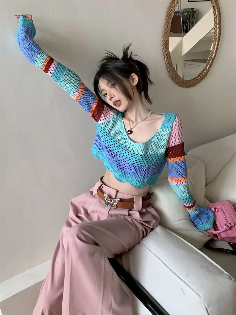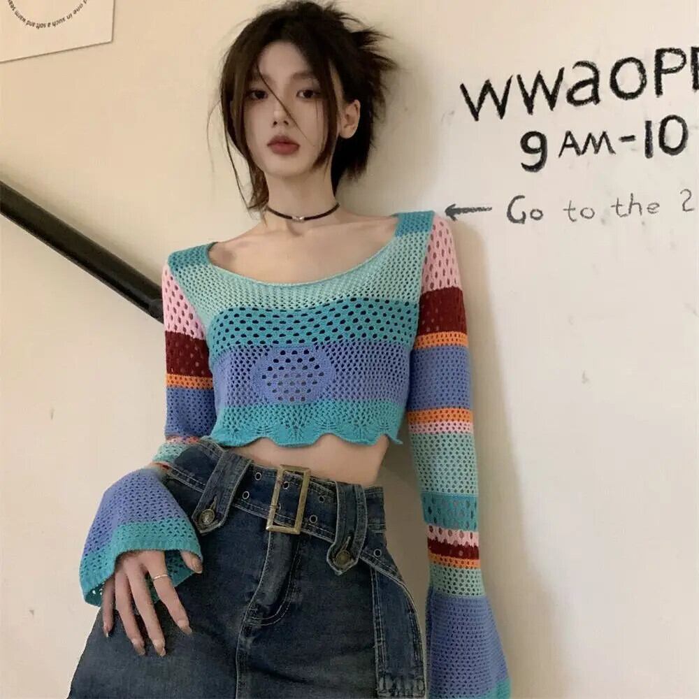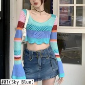 甘いホットガールストライプコントラストニットトップ夏フレア袖 O ネックショートプルオーバー フレアスリーブ 大人ガーリー スウィート キュート カジュアル サマー 夏物 Oネック