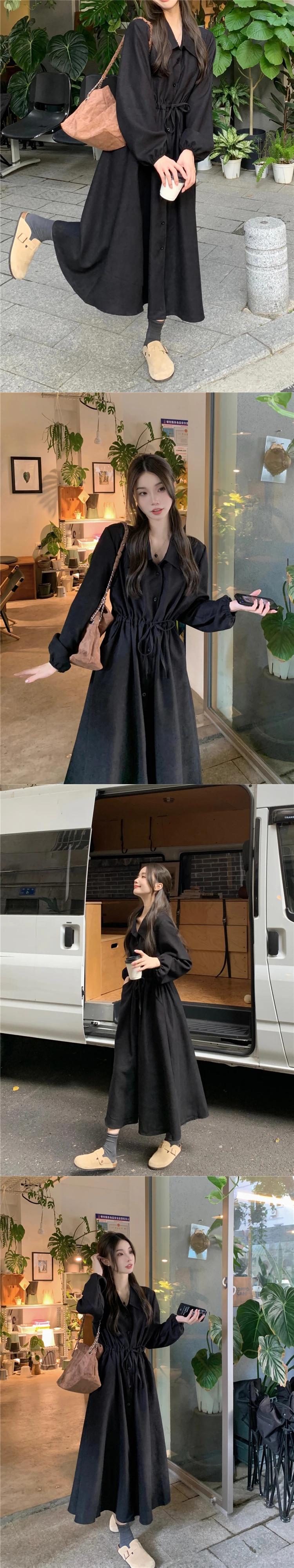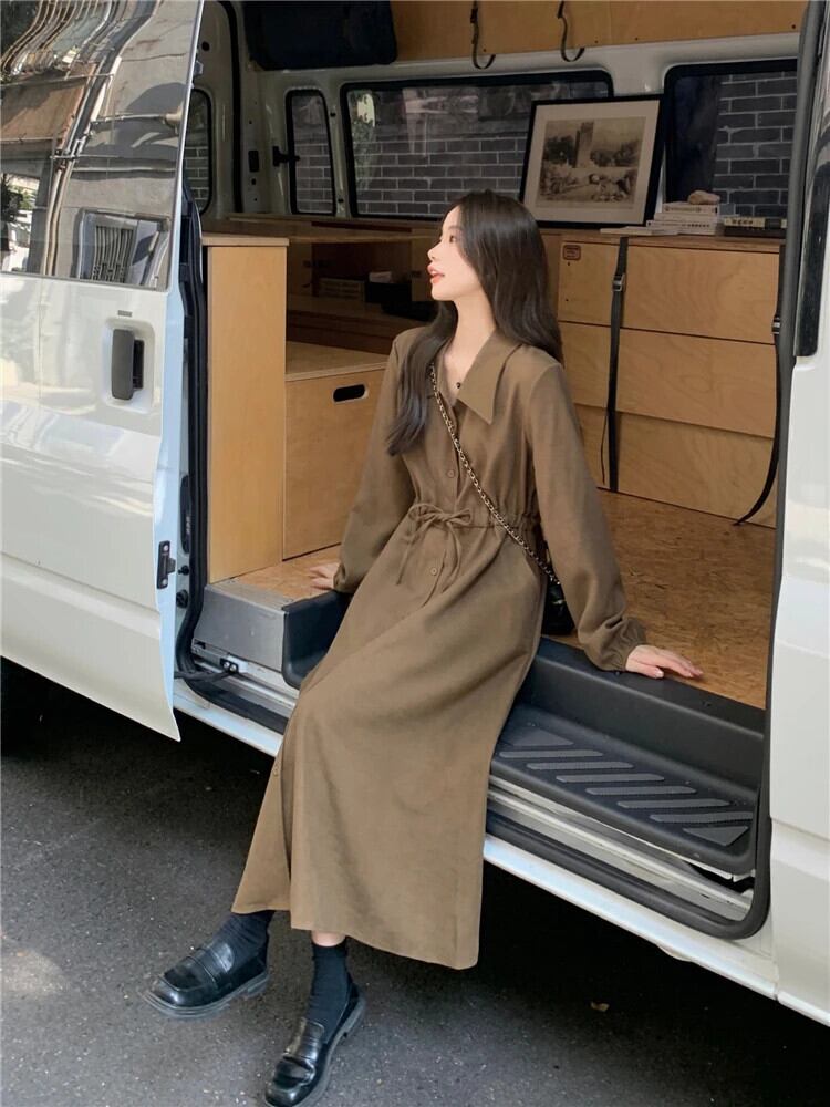 スウィートガールメイラードスタイルレトロ長袖ドレス春スリムフィット A ラインレースアップロングドレス 大人ガーリー キュート カジュアル スプリング 春物 Aライン