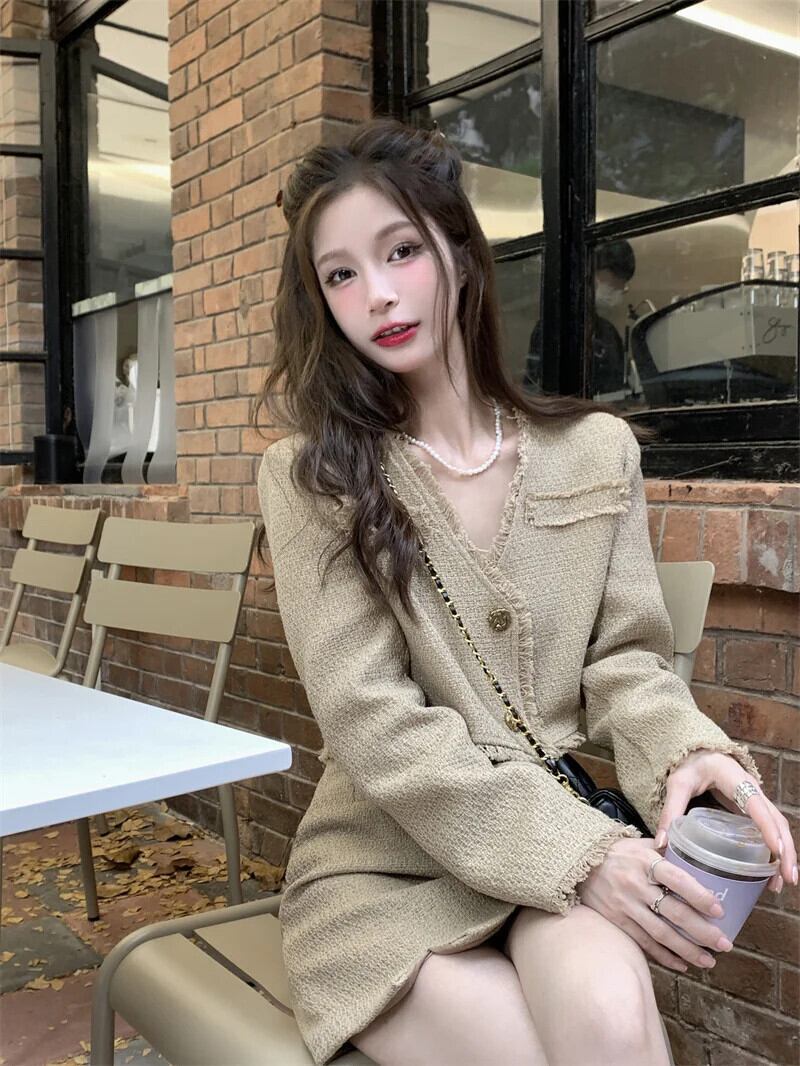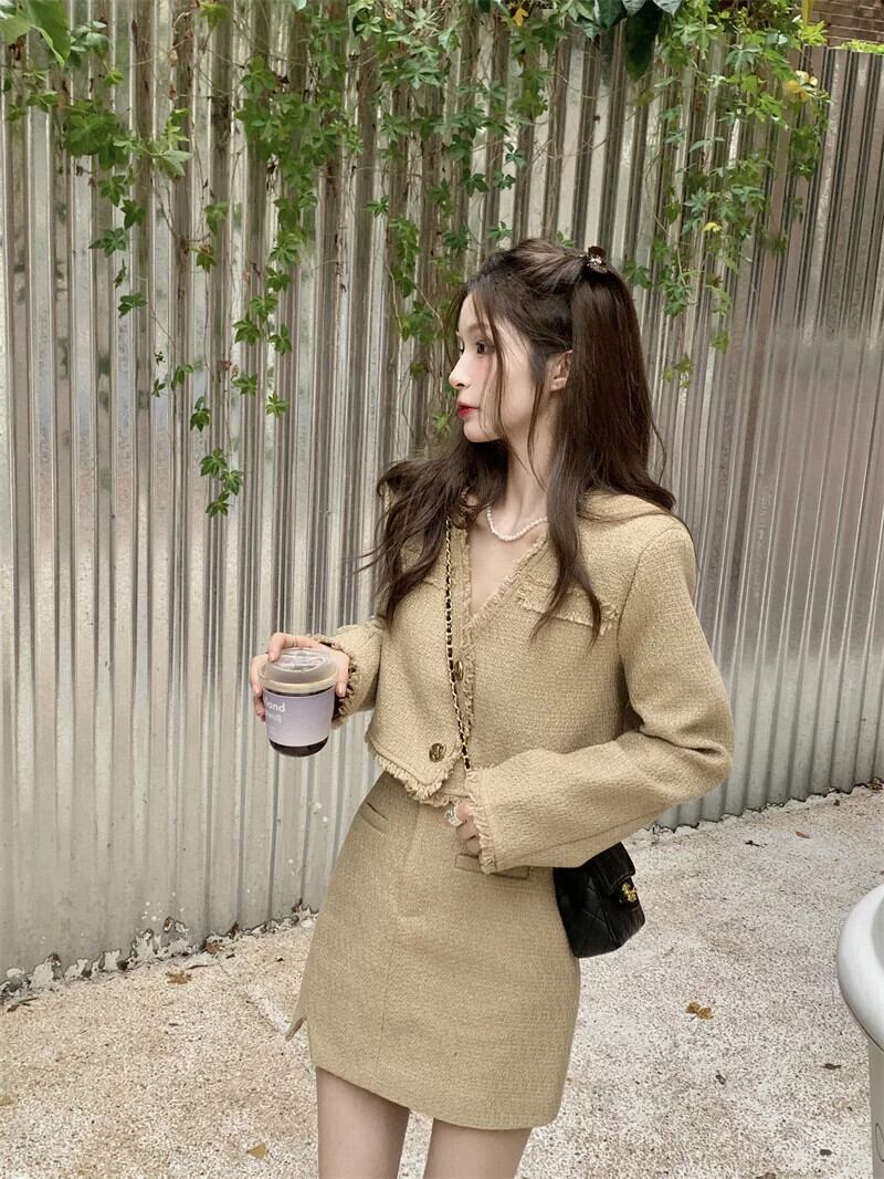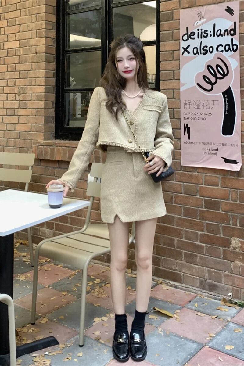 甘いホットガールレトロツイードスーツ春 V ネック電話ショートジャケットスプリットミニスカート 2 点セット 大人ガーリー スウィート キュート カジュアル スプリング 春物 Vネック