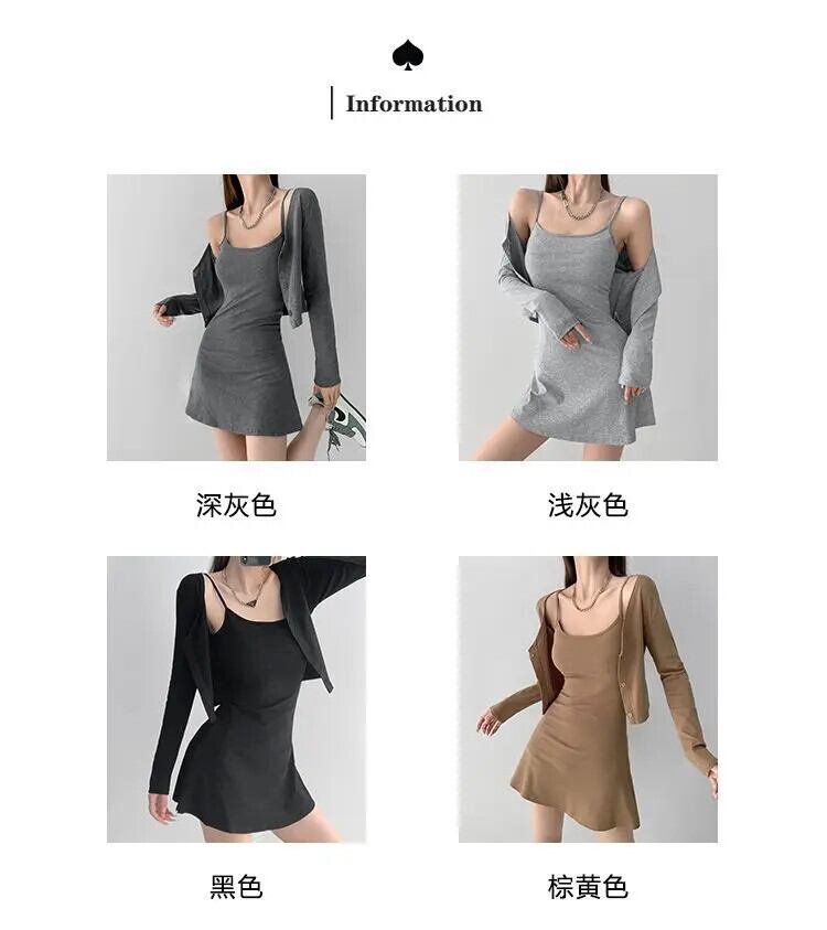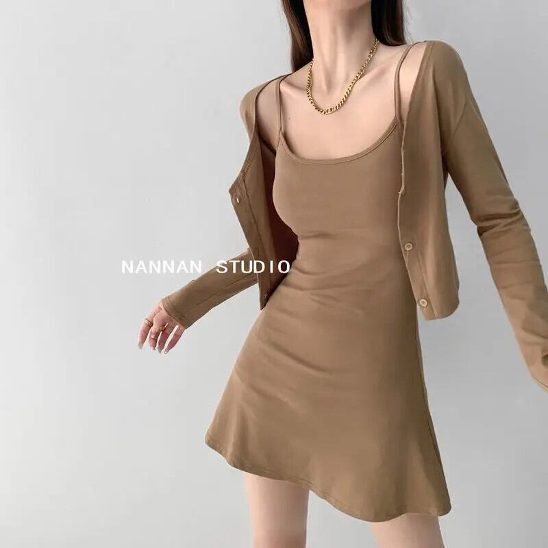 スイートホットガールスーツ春スリムフィットショートストラップドレス長袖ニットカーディガンツーピースセット ロング 大人ガーリー スウィート キュート カジュアル スプリング 春物