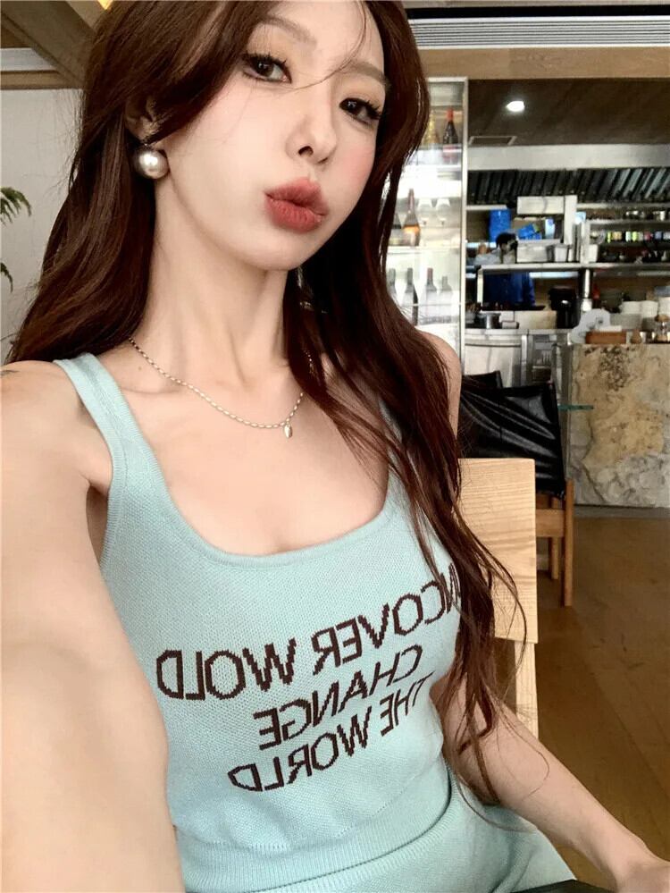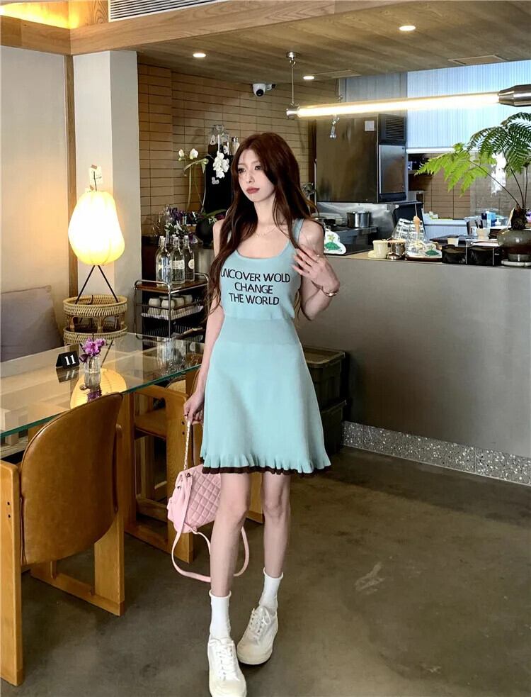 アメリカンスウィートホットガールレタージャカードニットドレス春スリムフィットAラインショートストラップドレス 大人ガーリー キュート カジュアル スプリング 春物