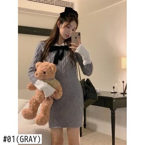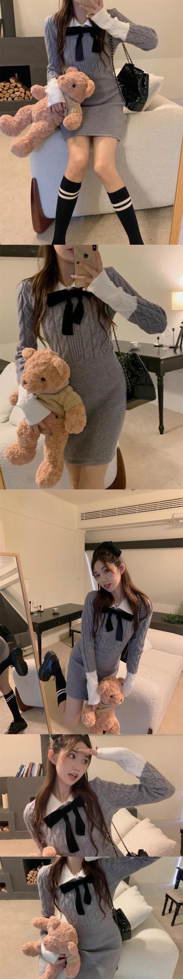 甘いホットガール純粋セクシーポロネックボウドレス秋長袖セクシーコントラストニットドレス ロング リボン 大人ガーリー スウィート キュート カジュアル オータム 秋物 Oネック ピュア