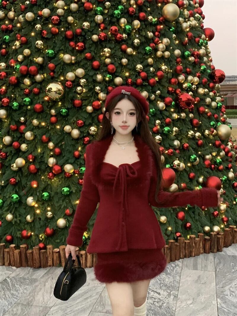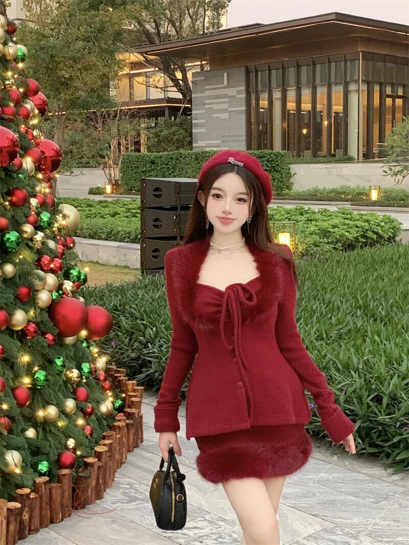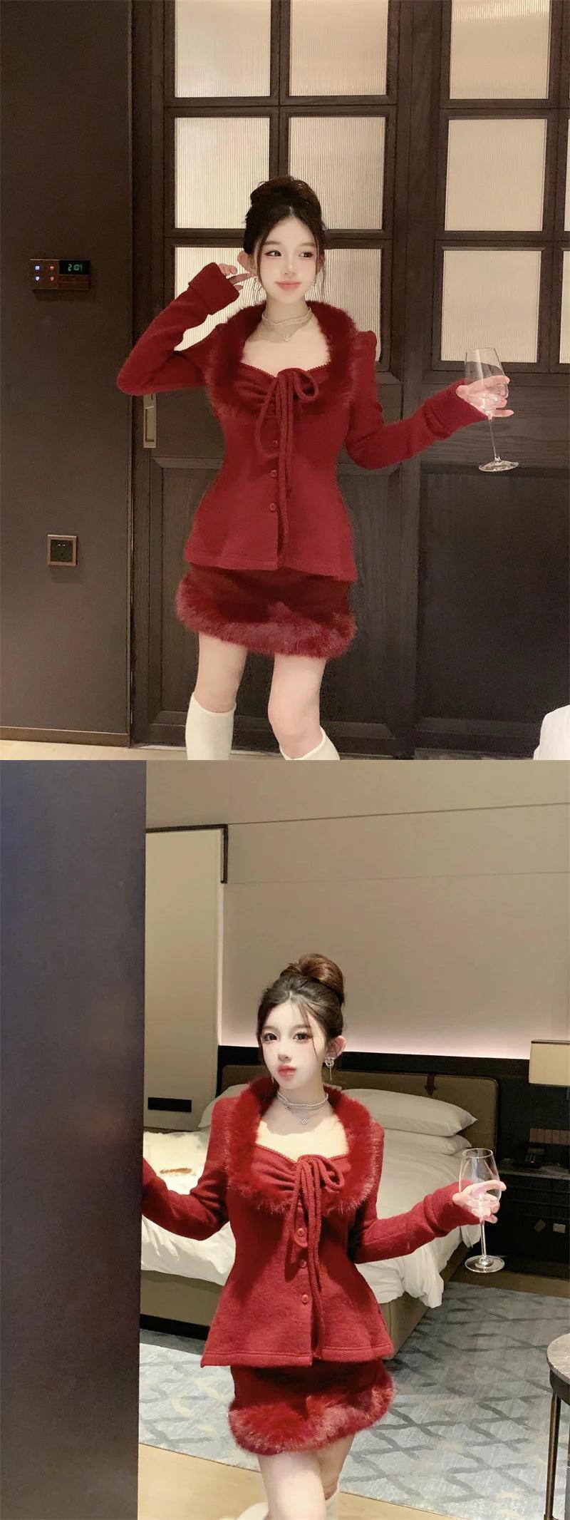 甘いホットガールスーツ冬毛皮襟ニットカーディガンウエストミニスカート 2 点セット Femlae 大人ガーリー スウィート キュート カジュアル ウィンター 冬物