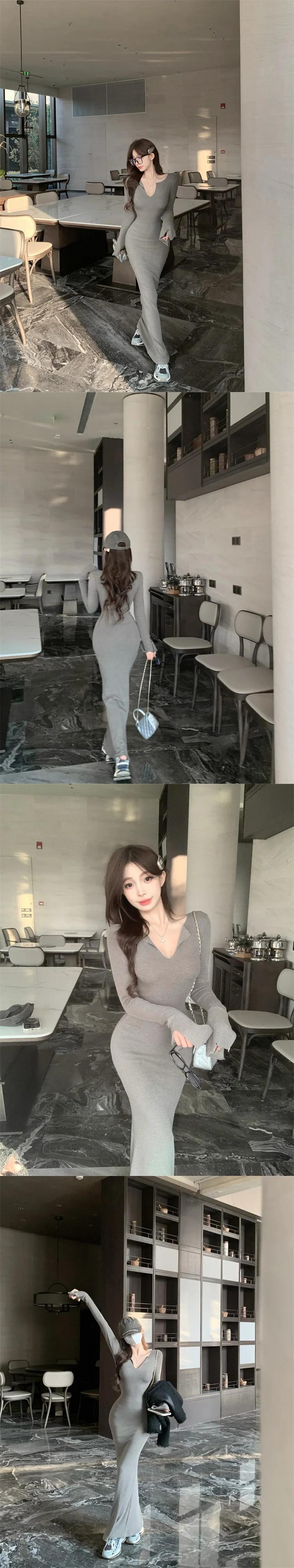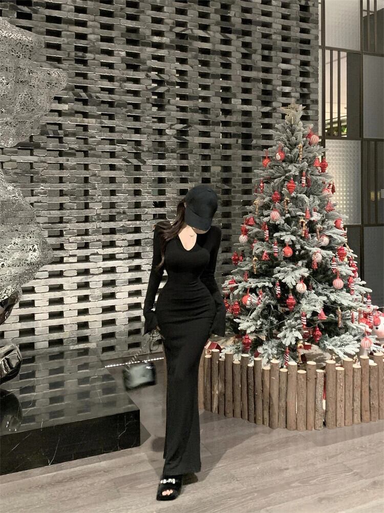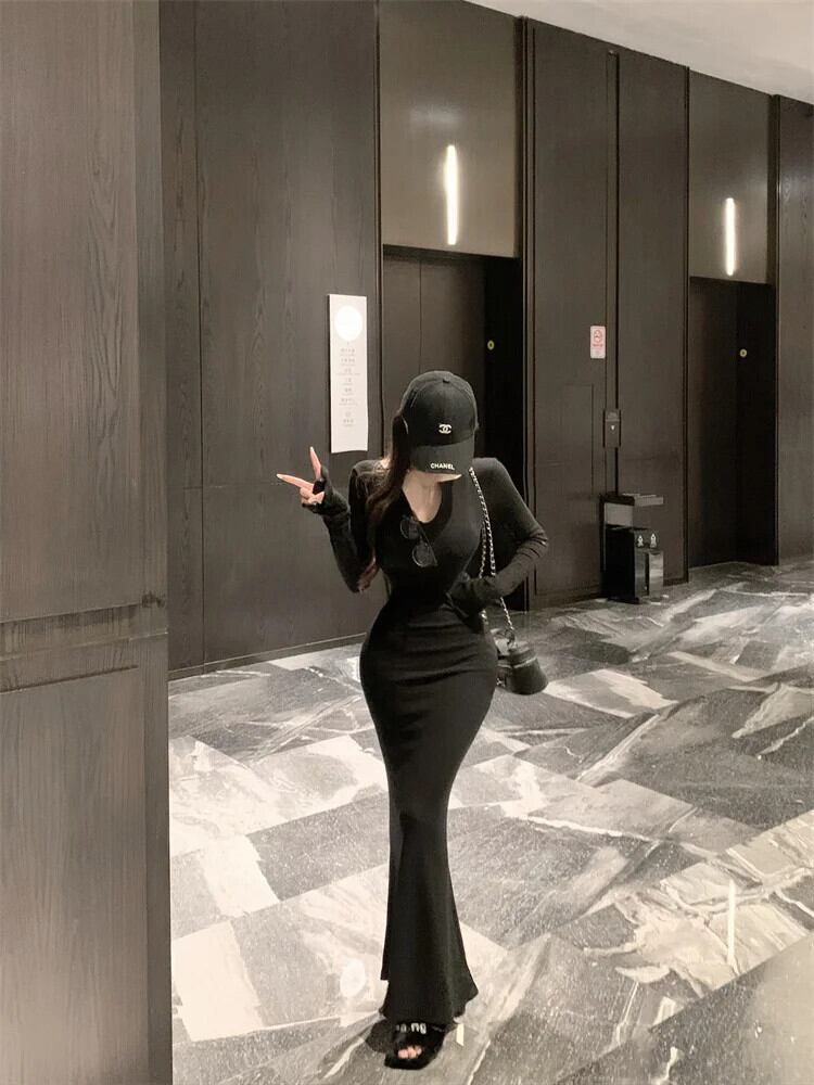 甘いホットガールマットマーメイドドレス秋と冬スリムフィットソリッドカラーセクシー長袖ドレス ロング 大人ガーリー スウィート キュート カジュアル オータム 秋物 ウィンター 冬物